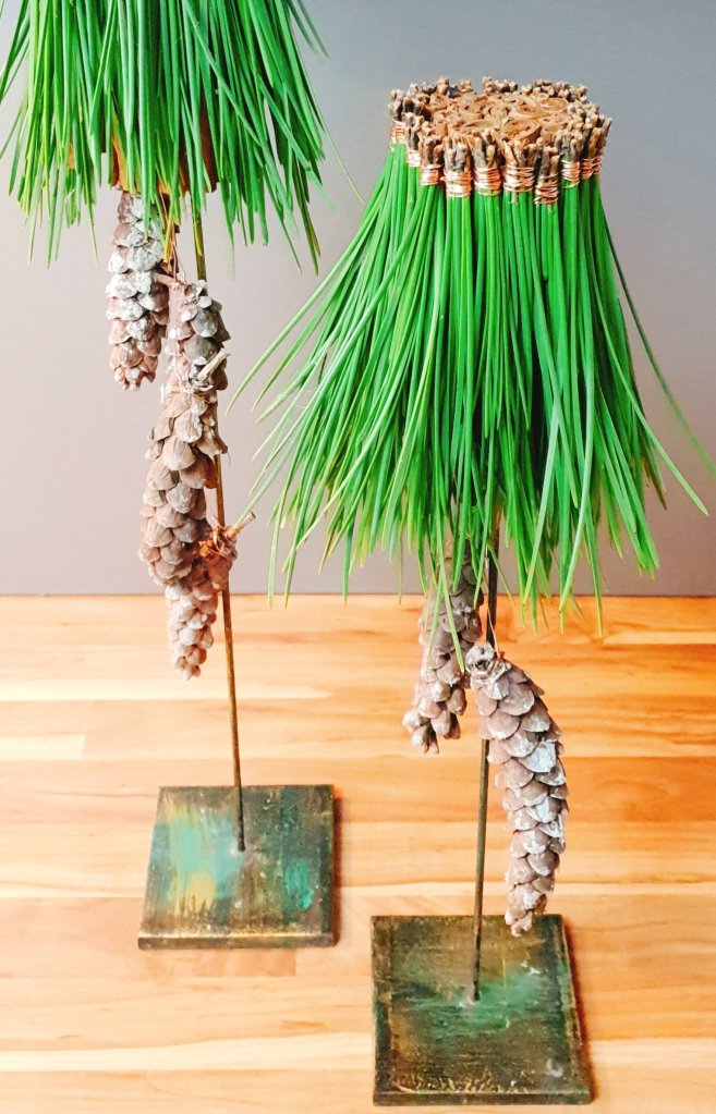 Eigentlich hatte ich Bäumchen aus Piniennadeln im Kopf, als ich begann zu basteln. Jeweils ein dicker Tannenzapfen sollte die Spitze bilden. Als ich sie obenauf setzte, gefiel mir das aber nicht. So wie sie waren, fand ich sie schöner.