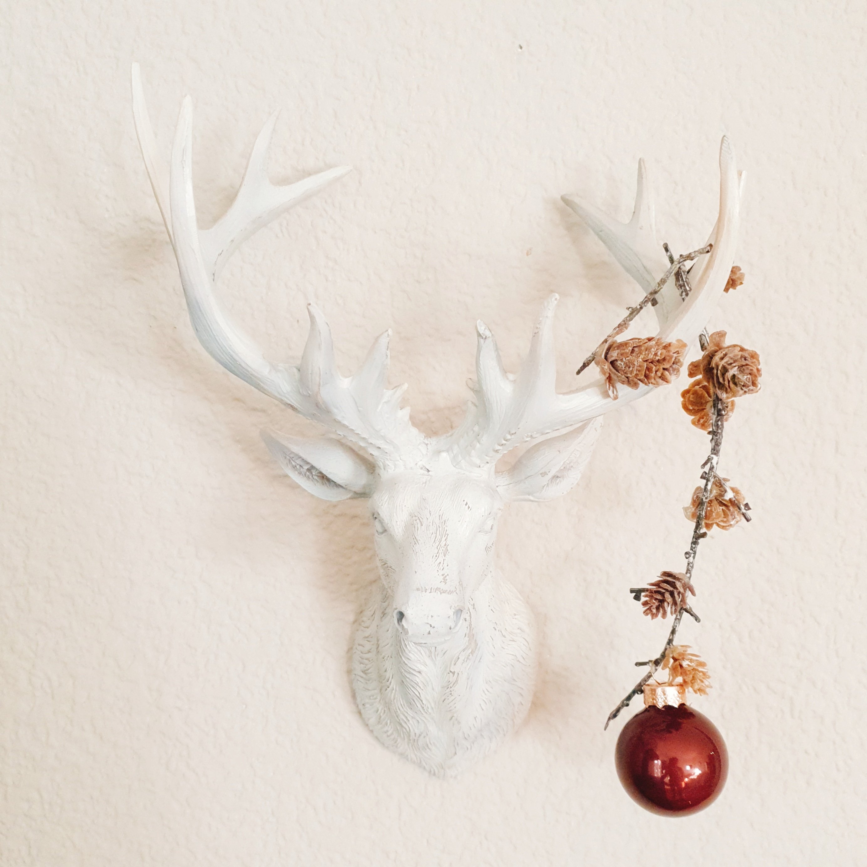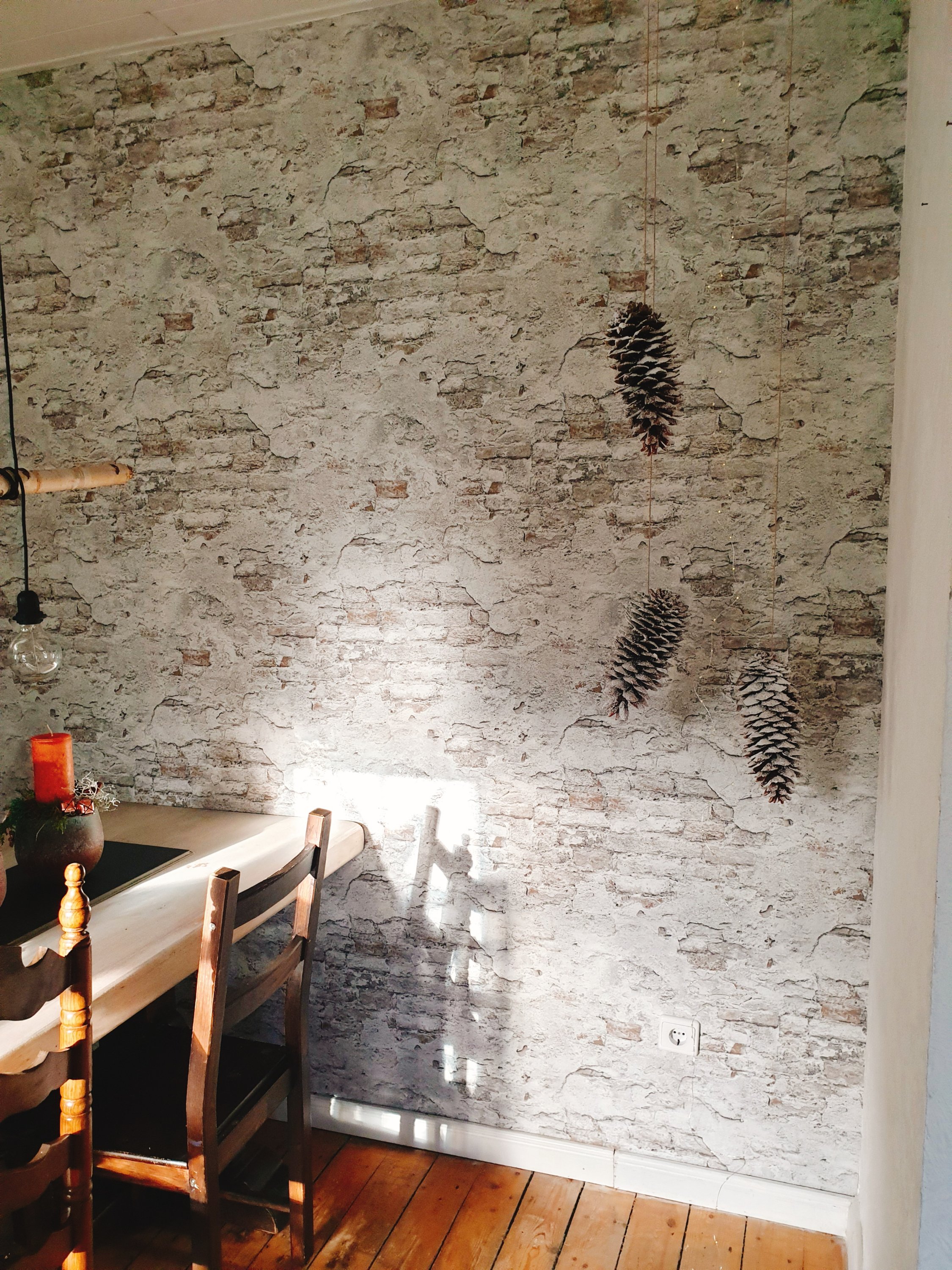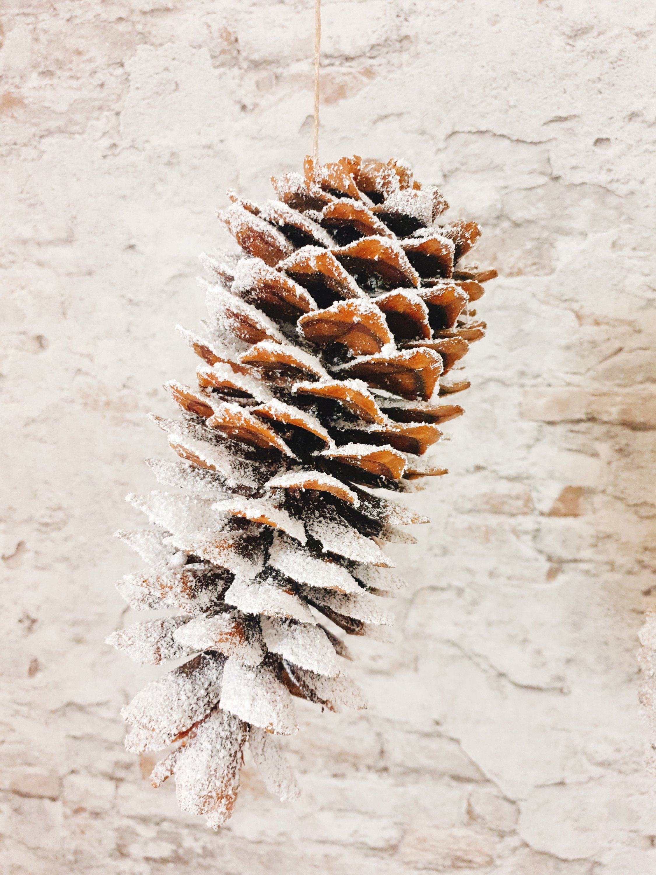 Für die großen Tannenzapfen habe ich natürlich noch ein Plätzchen gefunden. Mit Schnee aus der Sprühdose winterlich verziert dürfen sie jetzt von der Decke baumeln.