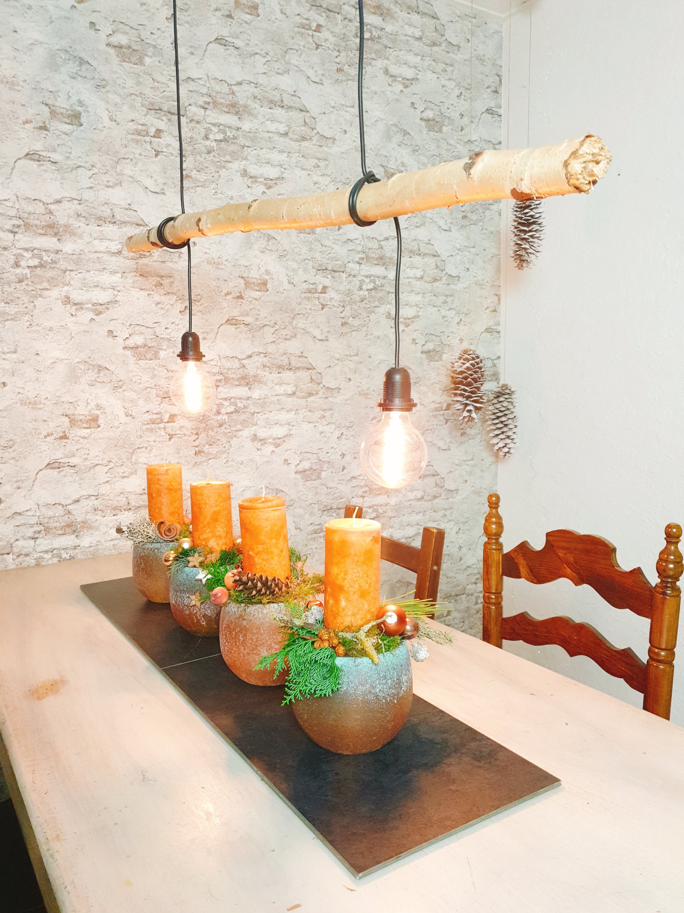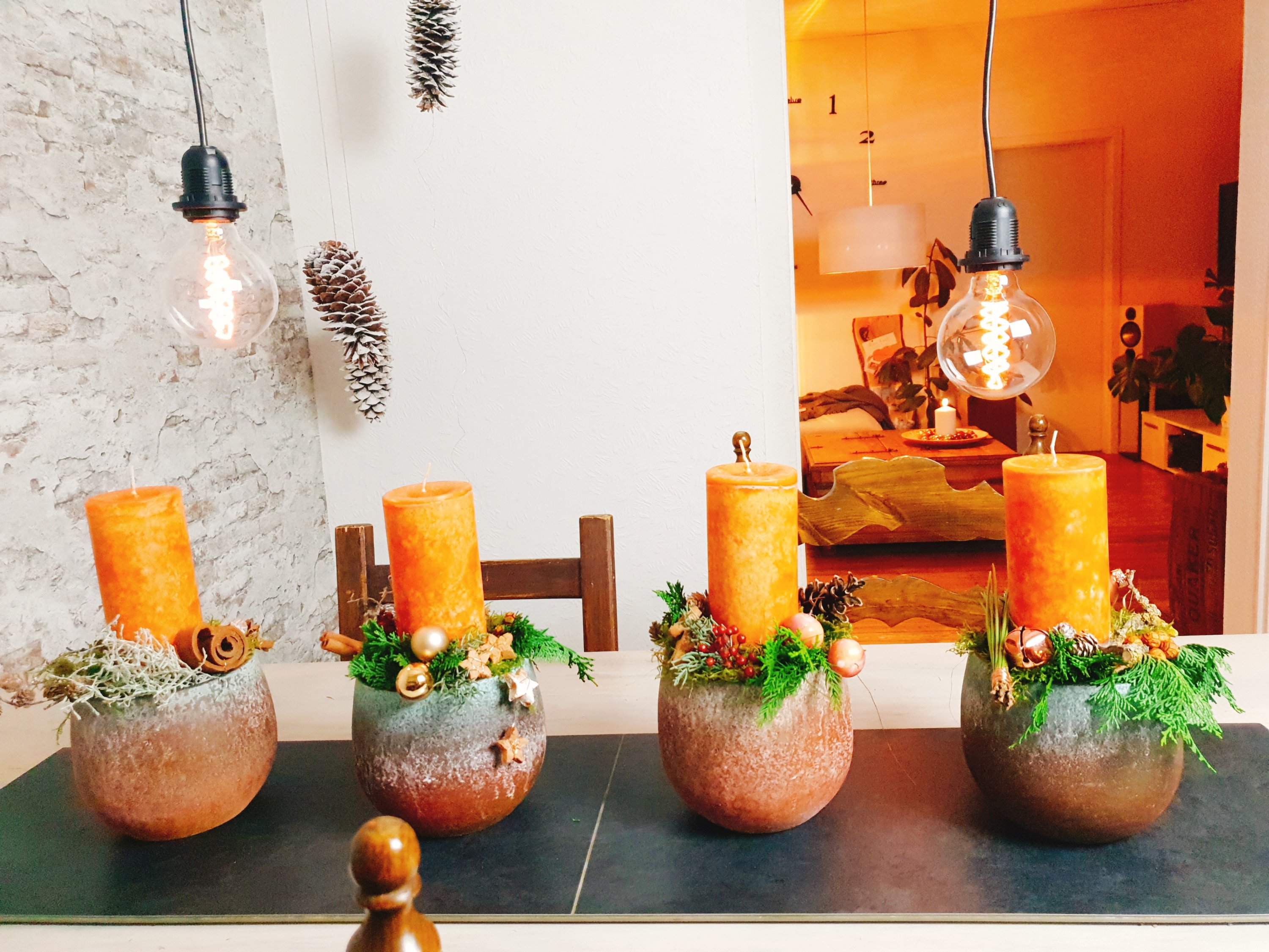 Diesmal habe ich keinen Adventkranz. Ich habe mich für 4 einzelne Töpfe entschieden. So kann ich die 4 Kerzen längs auf dem Esstisch platzieren oder auch im Karree auf unserem viereckigen Wohnzimmertisch.