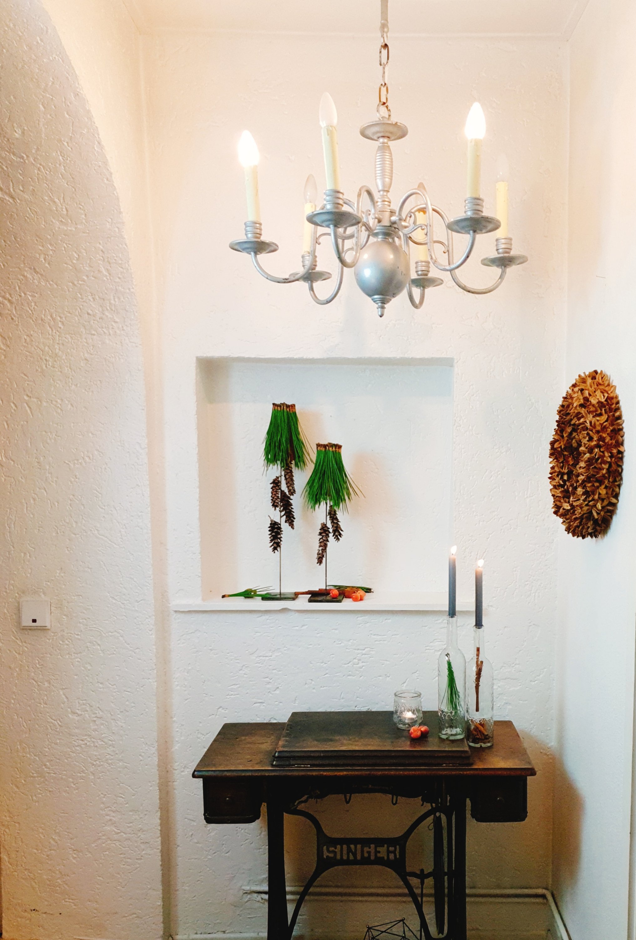 Wenn ich Tannengrün und kleine sonstige Schönheiten angeschleppt habe, dann kribbelt es mir in den Fingern und im Gehirnlappen (weiß jetzt gerade den medizinisch richtigen nicht, aber er kribbelt). Dann Kerze an (um die Drähte in die Advent-Kerzen zu basteln) und Musik und schon geht’s los.