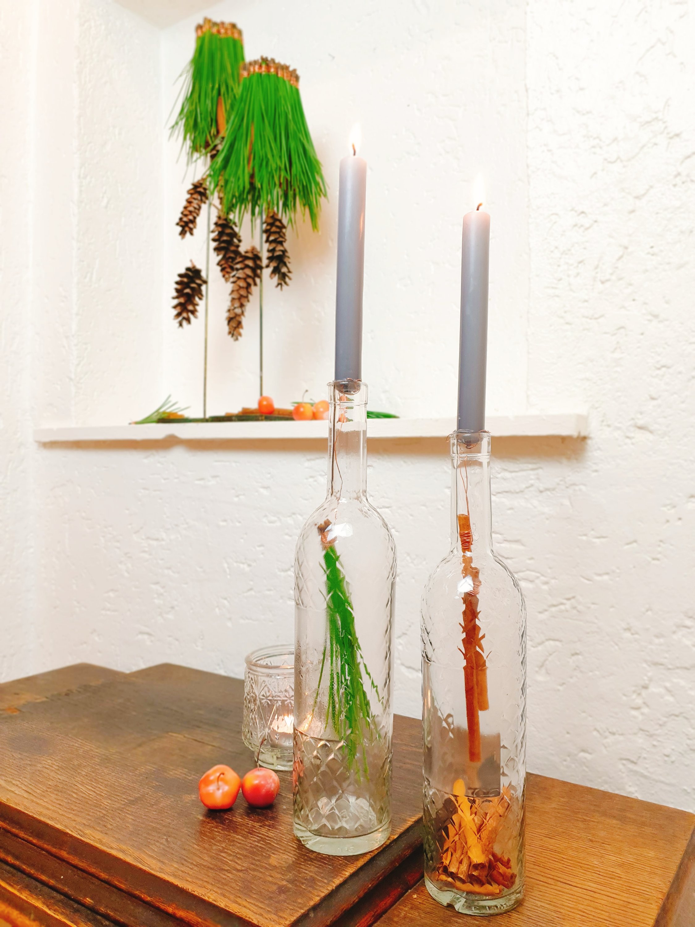 Ein paar Tannentapfen an Wickeldraht befestigen und die anderen Enden von unten mit Heißkleber zwischen die Zimtstangen (oder an den Kerzenleuchter) kleben, so dass sie herunterbaumeln.