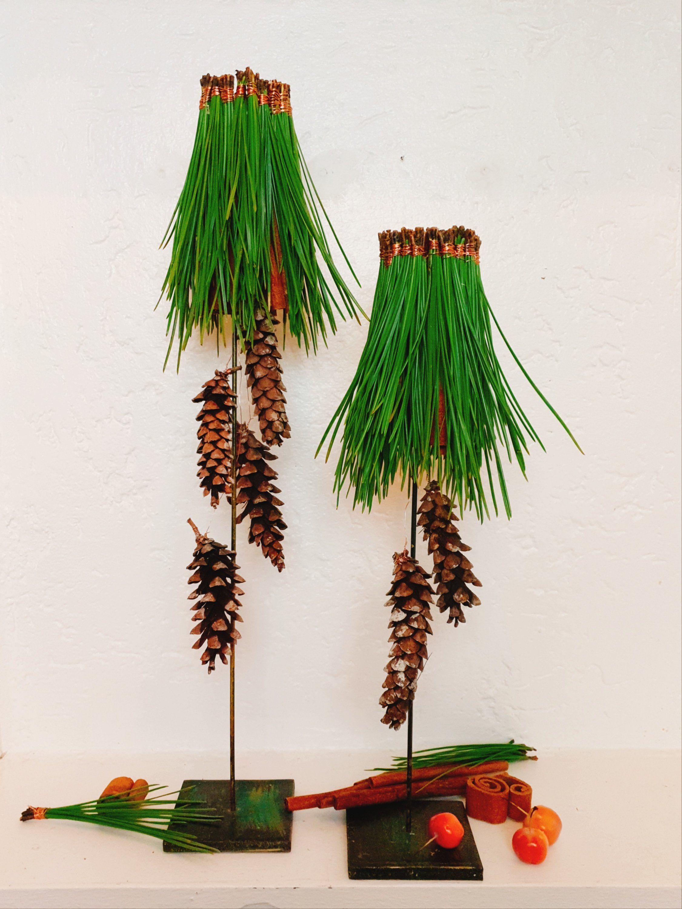 Entscheide selbst, ob du die Piniennadeln auf gleicher Höhe mit den Zimtstangen festklebst (hinteres Modell) oder überstehen lässt (wie vorne).