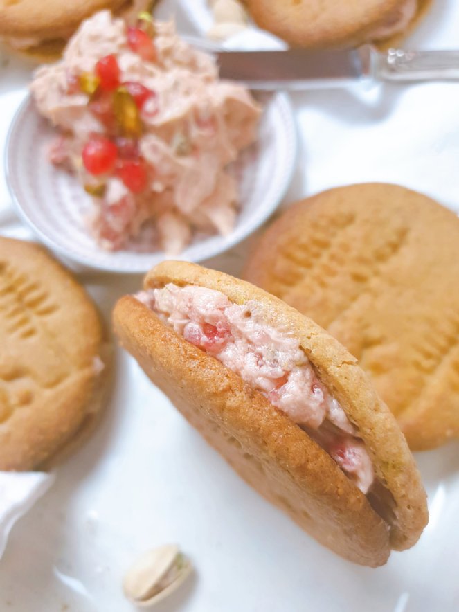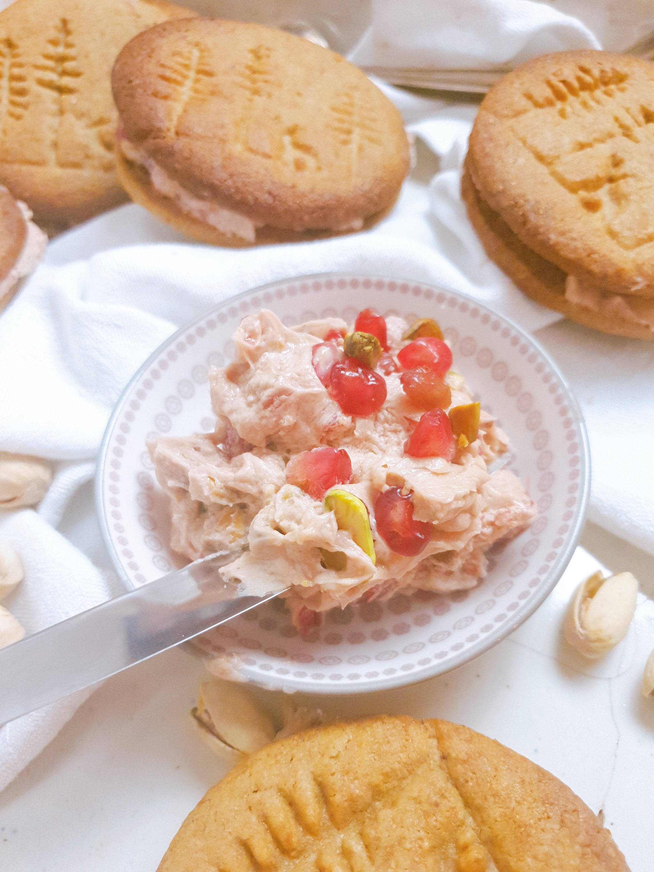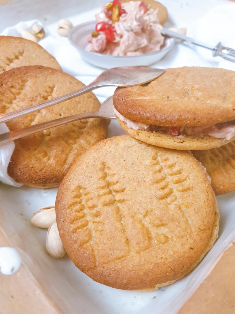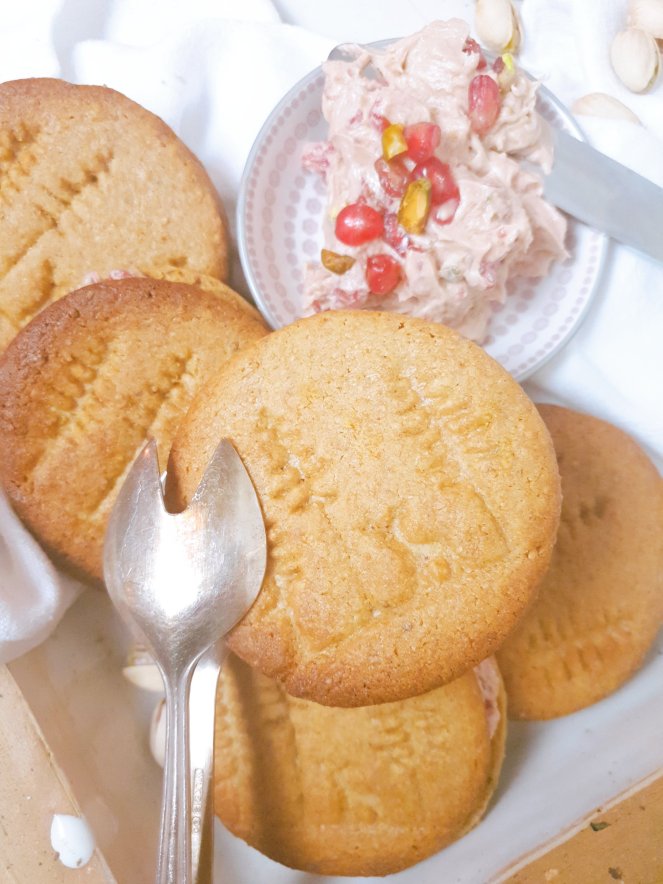 Als Doppelkeks mit der Creme, die durch die Knackigkeit der Granatapfelkerne und Pistazien in reiner Form die Aromen noch verstärkt, ist dieses Gebäck eine wahre Wonne! Und auf eine so ungewöhnliche Art lecker, dass ihr zusammen mit der Buttercreme dahinschmelzen werdet!