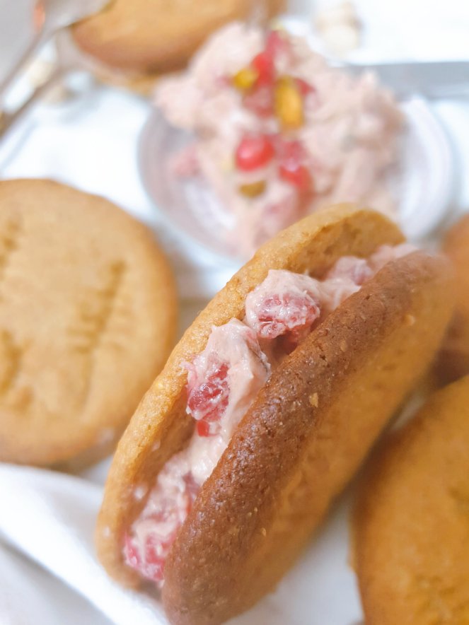 Tipp: Das geht am Besten, indem ihr den halbierten Apfel mit der Schnittseite über eine Schüssel haltet und mit einem Mörserstein von oben rundum auf den Apfel klopft. So fallen die ganzen Kerne heraus und die Haut zwischen den Kernen bleibt im Apfel, ohne dass eine riesige Ferkelei entsteht, versprochen! Die Fruchtkerne und die Pistazien unter die schöne rosa Creme mischen und jeweils einen gestrichenen Esslöffel zwischen zwei Kekse streichen.