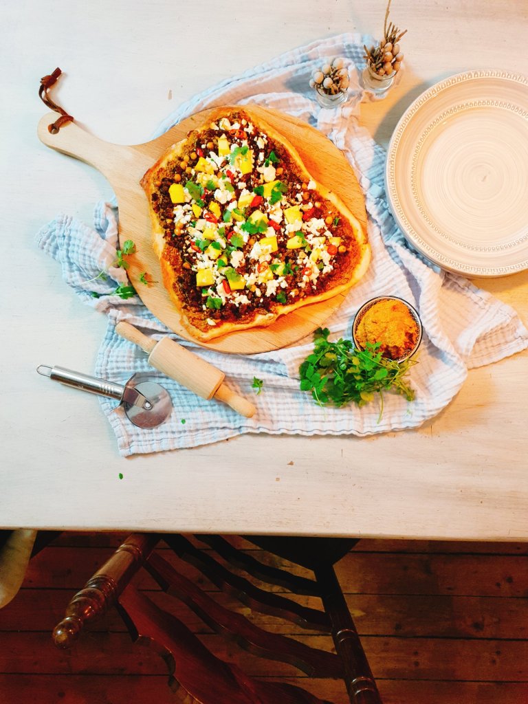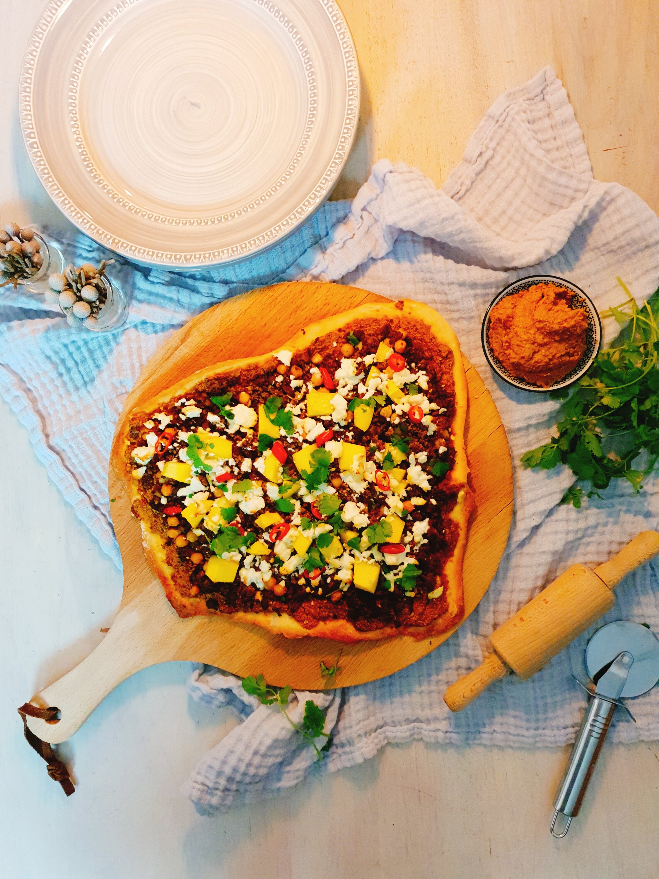 Den vorbereiteten Pizzateig mit ein paar Esslöffeln des Hummus einstreichen, dabei den Rand freilassen. Das Hackfleisch auf dem Hummus verteilen, ebenso die zur Seite gelegten Kichererbsen, dann Mango, Feta und Chili.