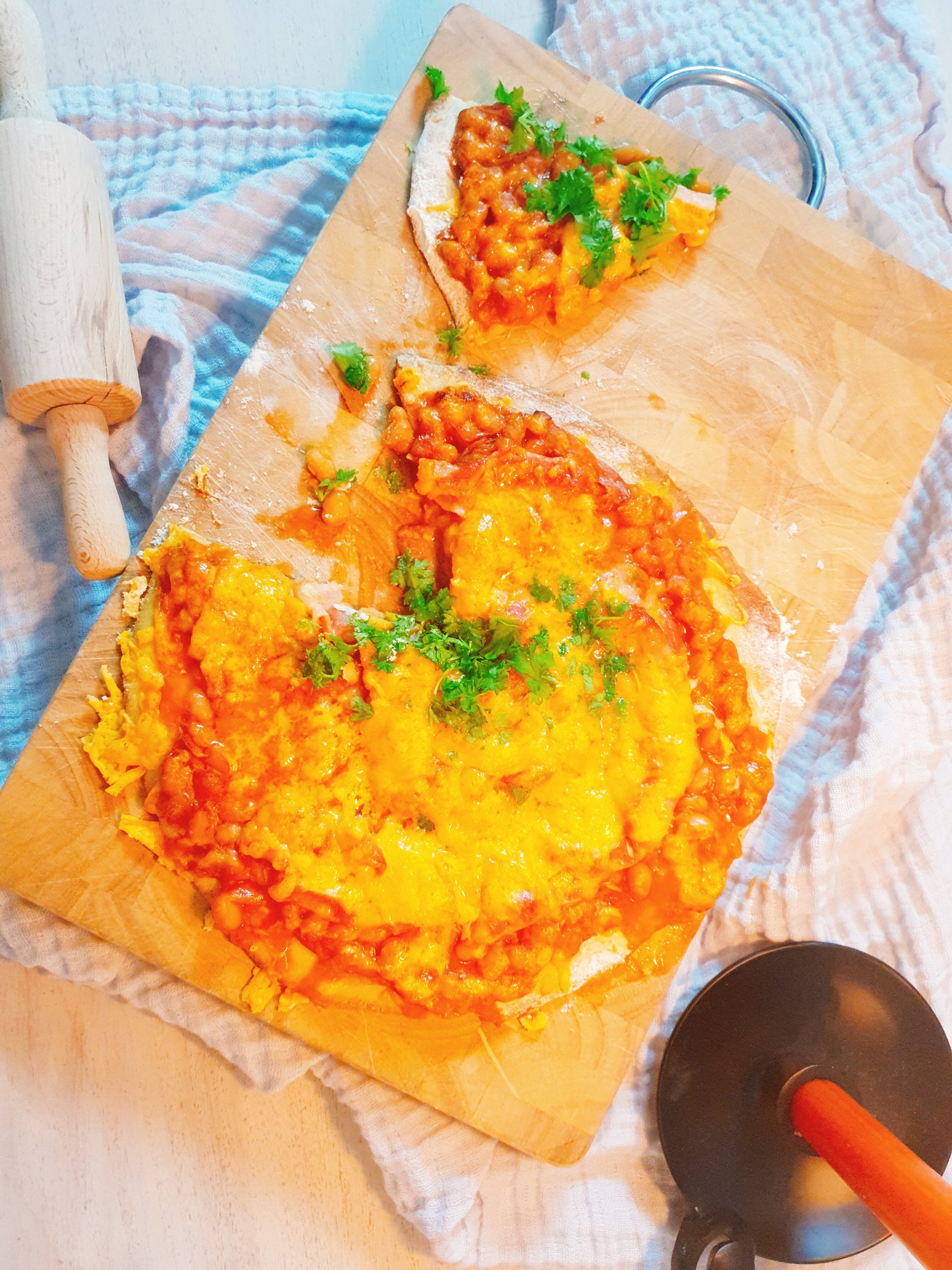Tomatensauce, Baked Beans, Speck, Cheddar