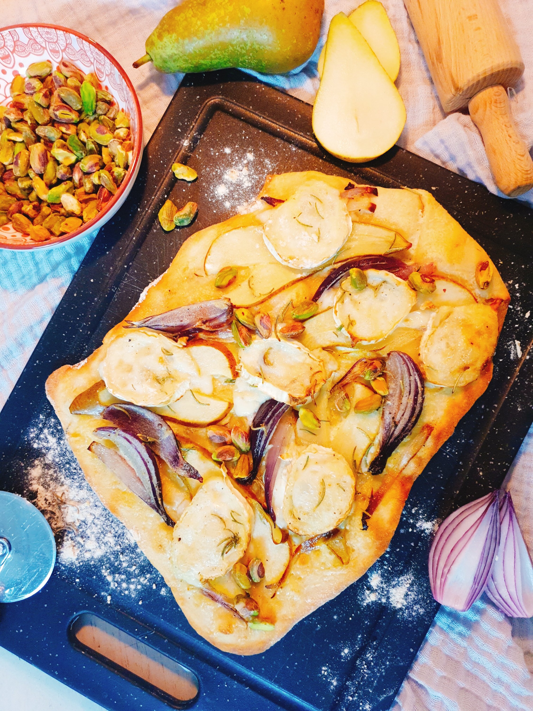 Schmand, Birne, Ziegenkäse, Zwiebeln, Pistazien, Honig