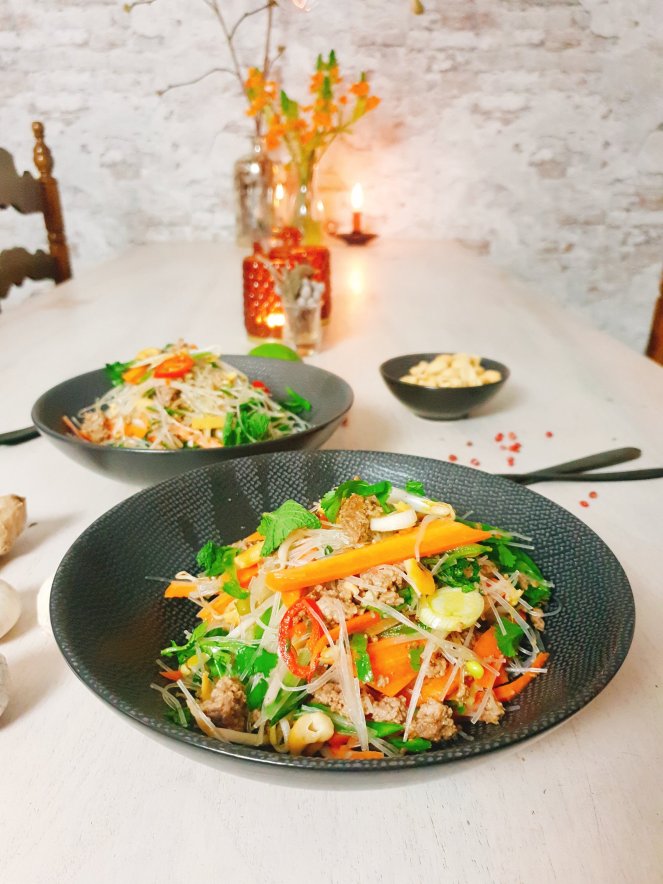 Die vietnamesische Küche ist so besonders frisch, das begeistert mich immer wieder aufs Neue. Dazu die verschiedenen Aromen und Konsistenzen. Einfach wunderbar. Bei diesem Salat kommt keine Langeweile auf. Und Brot & Co. könnt ihr getrost weglassen – denn obgleich der Salat so leicht und spritzig ist, macht er durch die Nudeln richtig satt.