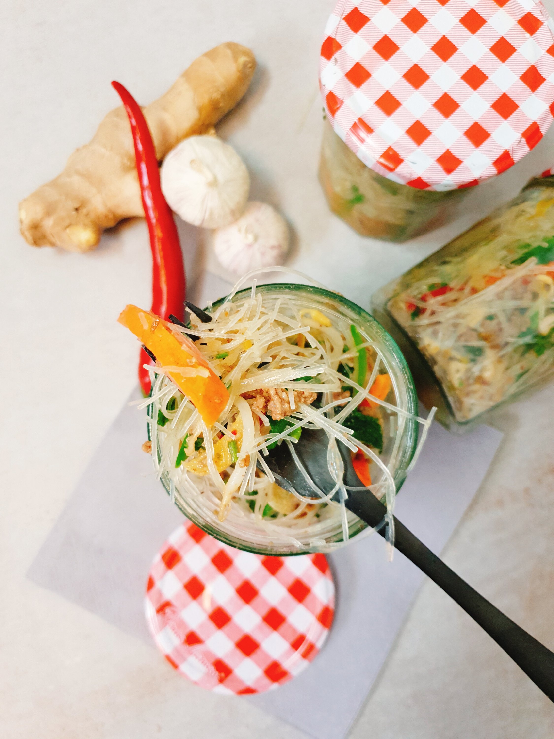 Die Reisnudeln in heißes Wasser legen, nach ein paar Minuten mit der Schere klein schneiden und abtropfen lassen. Möhren und Zuckerschoten in feine Streifen, Frühlingszwiebeln und Chili in Ringe schneiden. Die Kräuter und die Nüsse grob hacken.