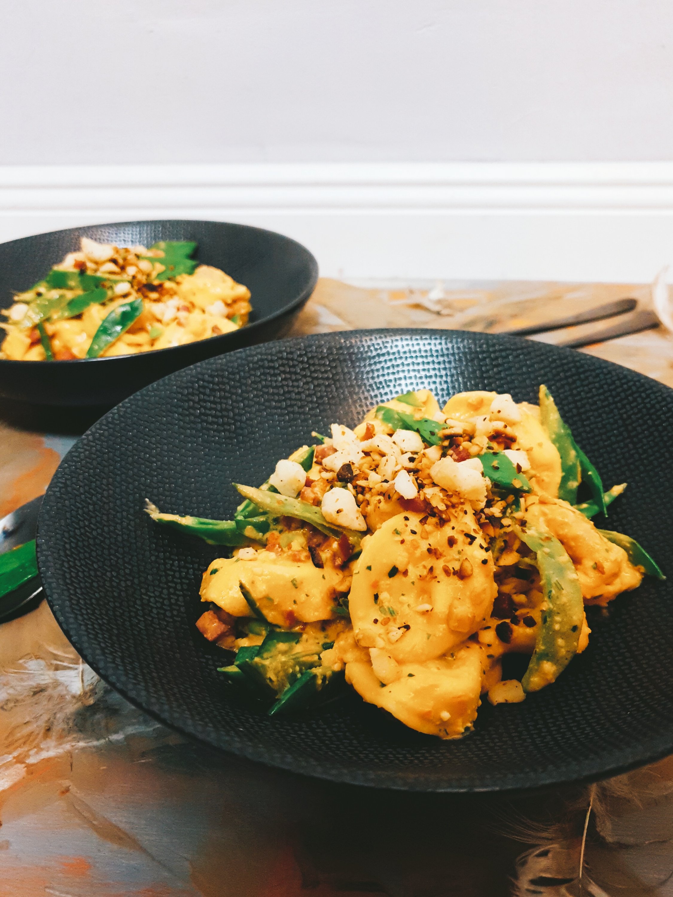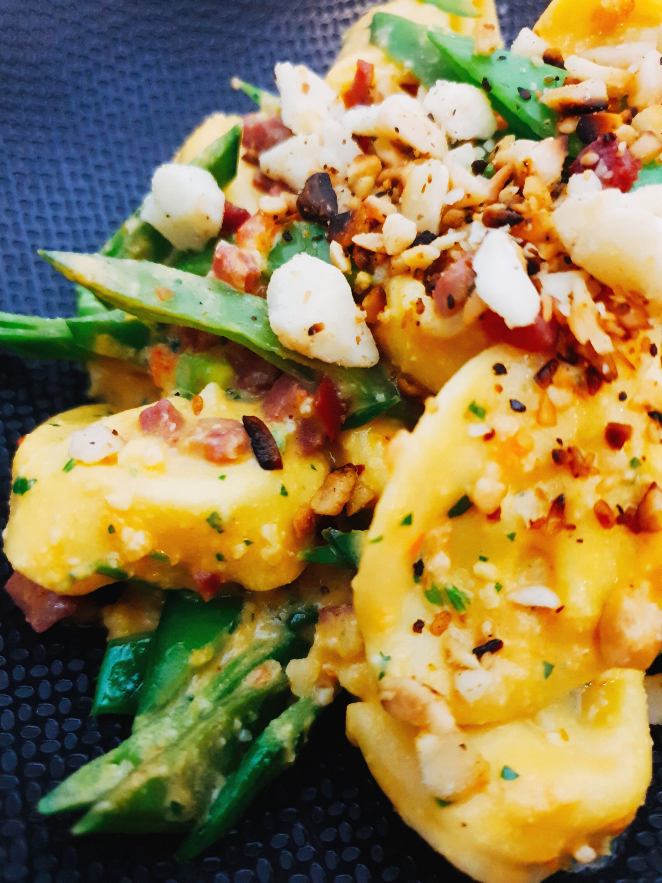 Den Speck in die Pfanne geben und anbraten (Veggies lassen ihn einfach weg). Die Zuckererbsen in feine Streifen schneiden und für einige Minute mitbraten. Zusammen mit dem Pesto unter die heißen Nudeln geben.