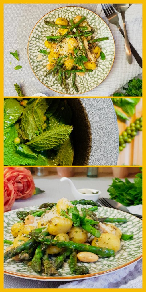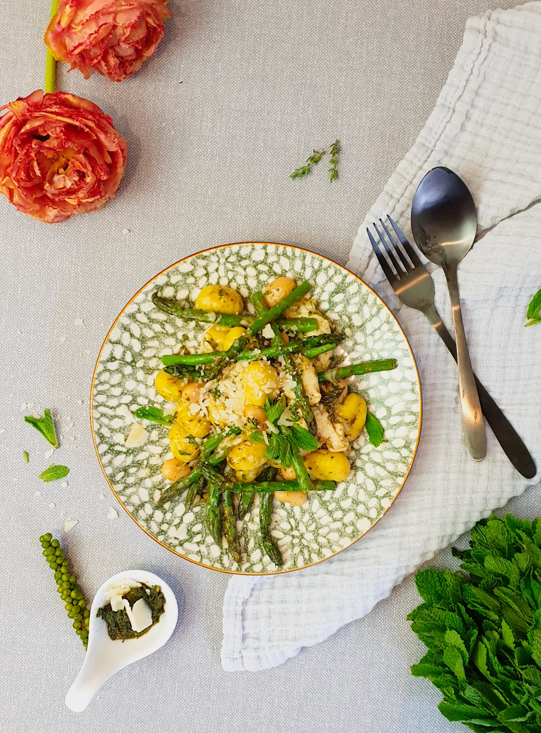 Jetzt noch einmal durchmischen, schnell auf Tellern anrichten und mit den Minzblättchen und etwas Parmesan garnieren.