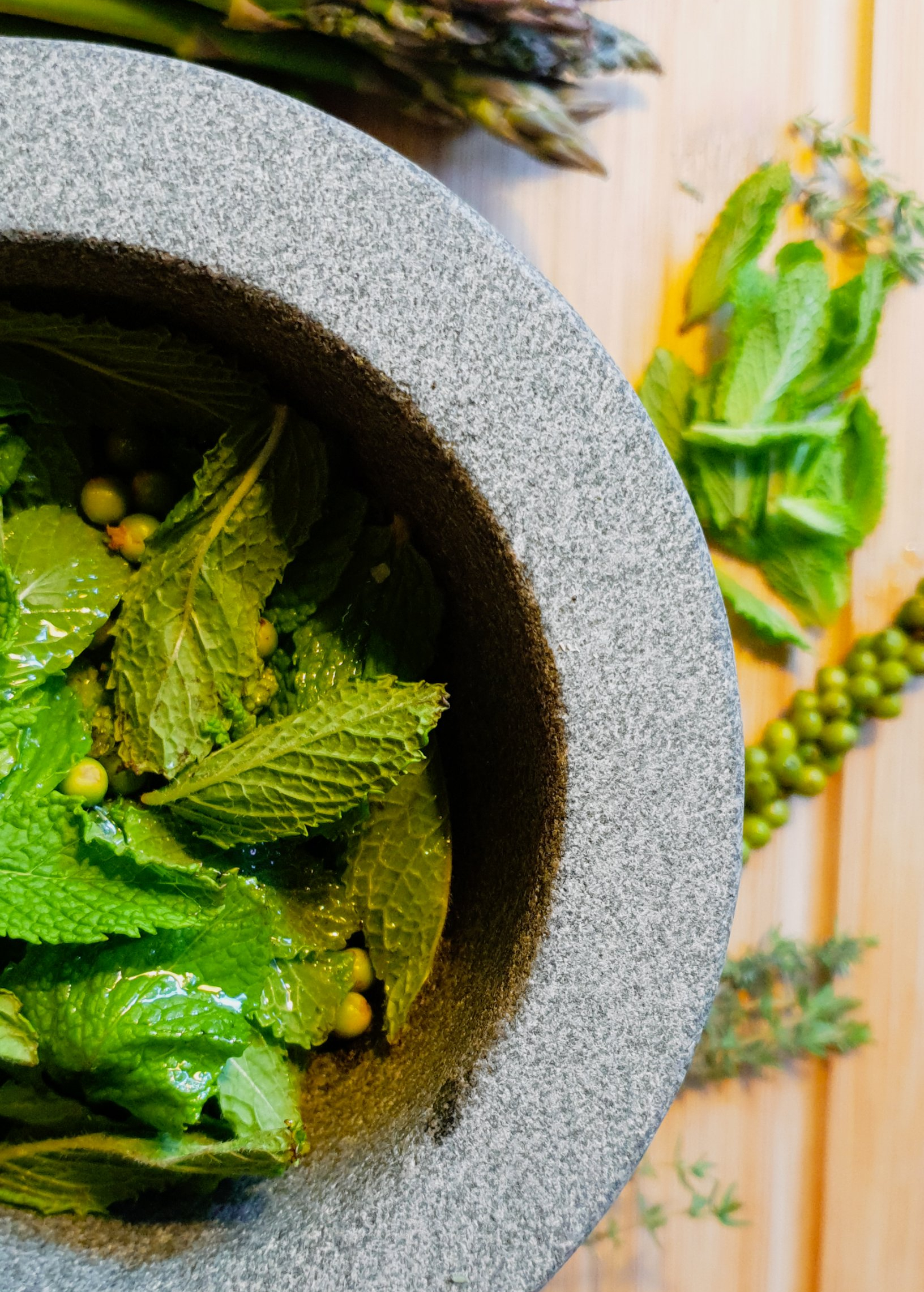Die Minzblätter vom Stengel in einen Mörser zupfen, dabei die kleinen Blättchen an den Spitzen zur Seite legen. Einen EL grobes Salz, 5 EL Olivenöl sowie die Thymianblättchen und die frischen Pfefferkörner (ca. 3 cm – ca. 50 Stück) dazugeben.