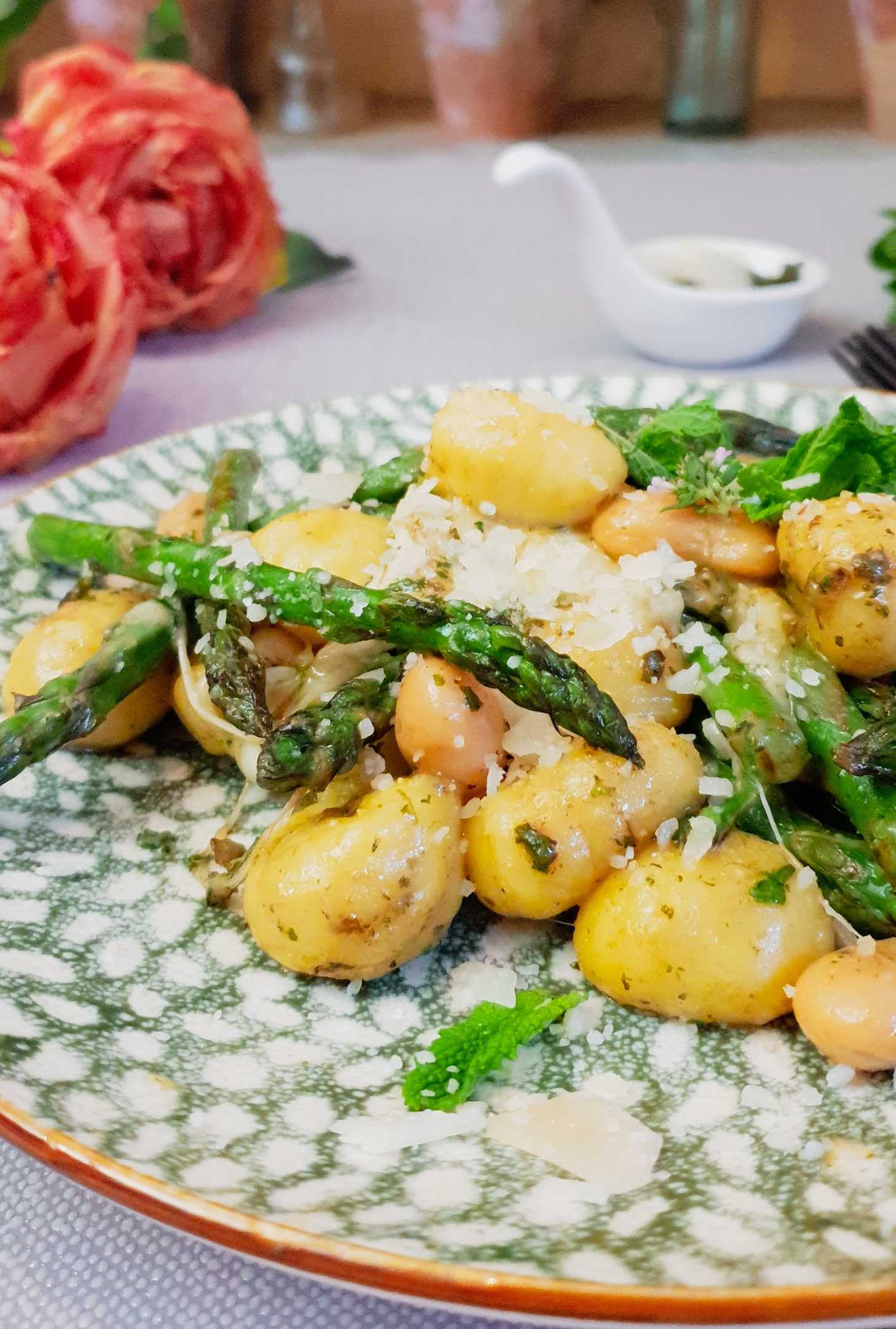 Die abgetropften Bohnen zum Spargel geben, kurz mitbraten und mit der Sahne ablöschen. Die Gnocchi mit der Schaumkelle in die Pfanne geben, etwas von dem Kochwasser dazugeben. Das Kräuteröl unter die Gnocchis und das Gemüse schwenken und den Mozzarella darüberzupfen, so dass er noch leicht erhitzt wird.