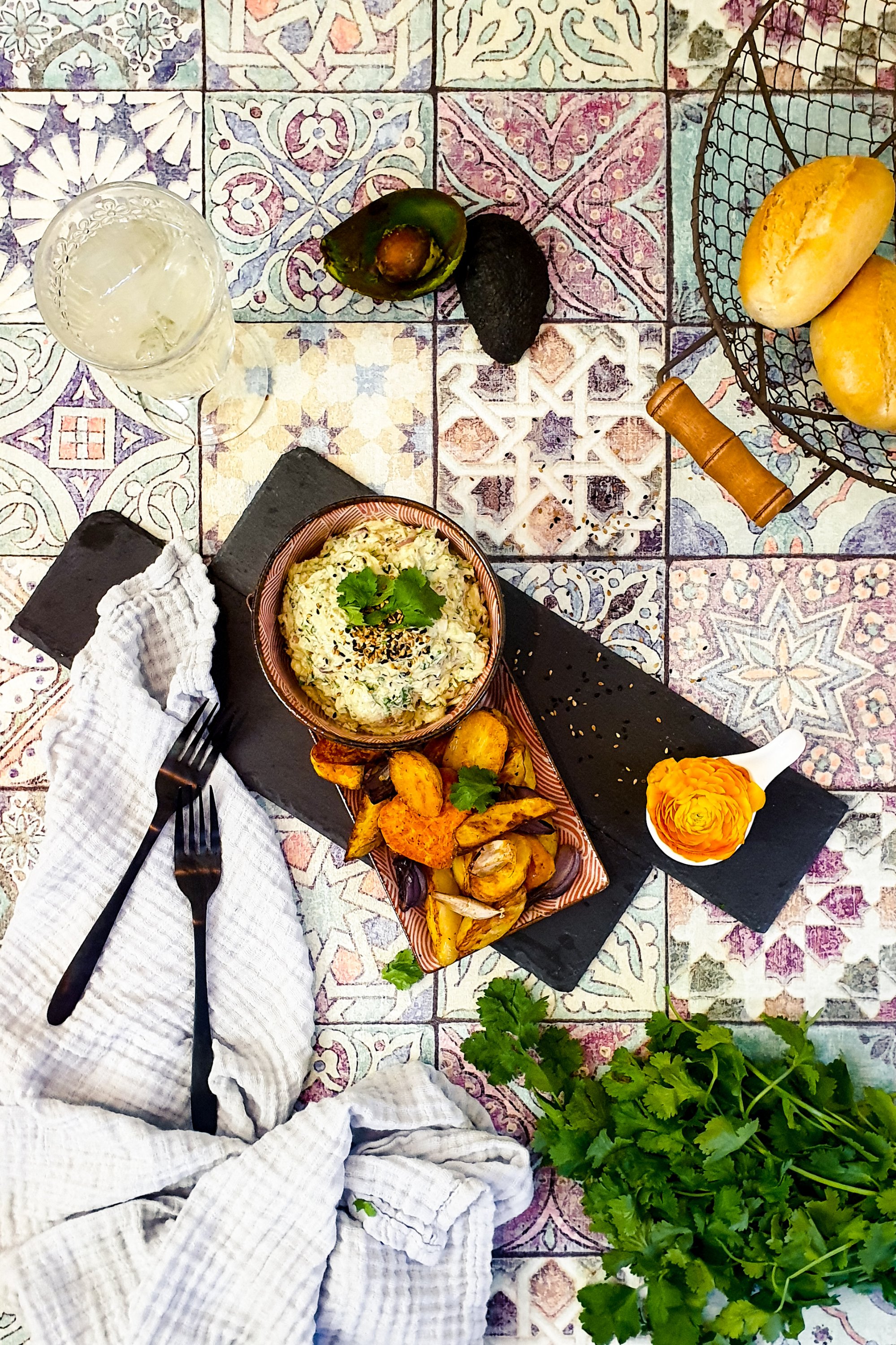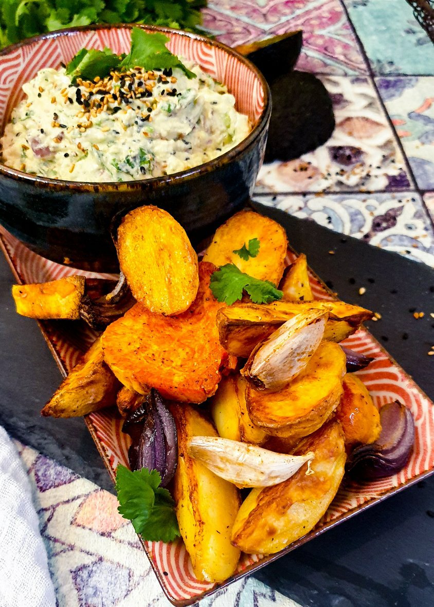 Ein wunderbares Veggie-Essen! Heiße würzige Kartoffeln aus dem Ofen und ein leckerer cremiger Dipp dazu – was will man mehr?!
