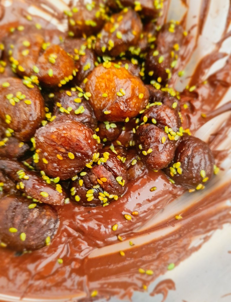 Habt ihr bereits die Schokopflaumen mit Tonkabohne und Sumach gefunden? Für die heutige Maronen-Variante verbrauchte ich die Reste der Schokoglasur aus eben diesem Rezept und verarbeitete sie weiter. Im Grunde habe ich in die Schubladen gesehen und spontan zugegriffen. Wie eben neue Ideen so entstehen…