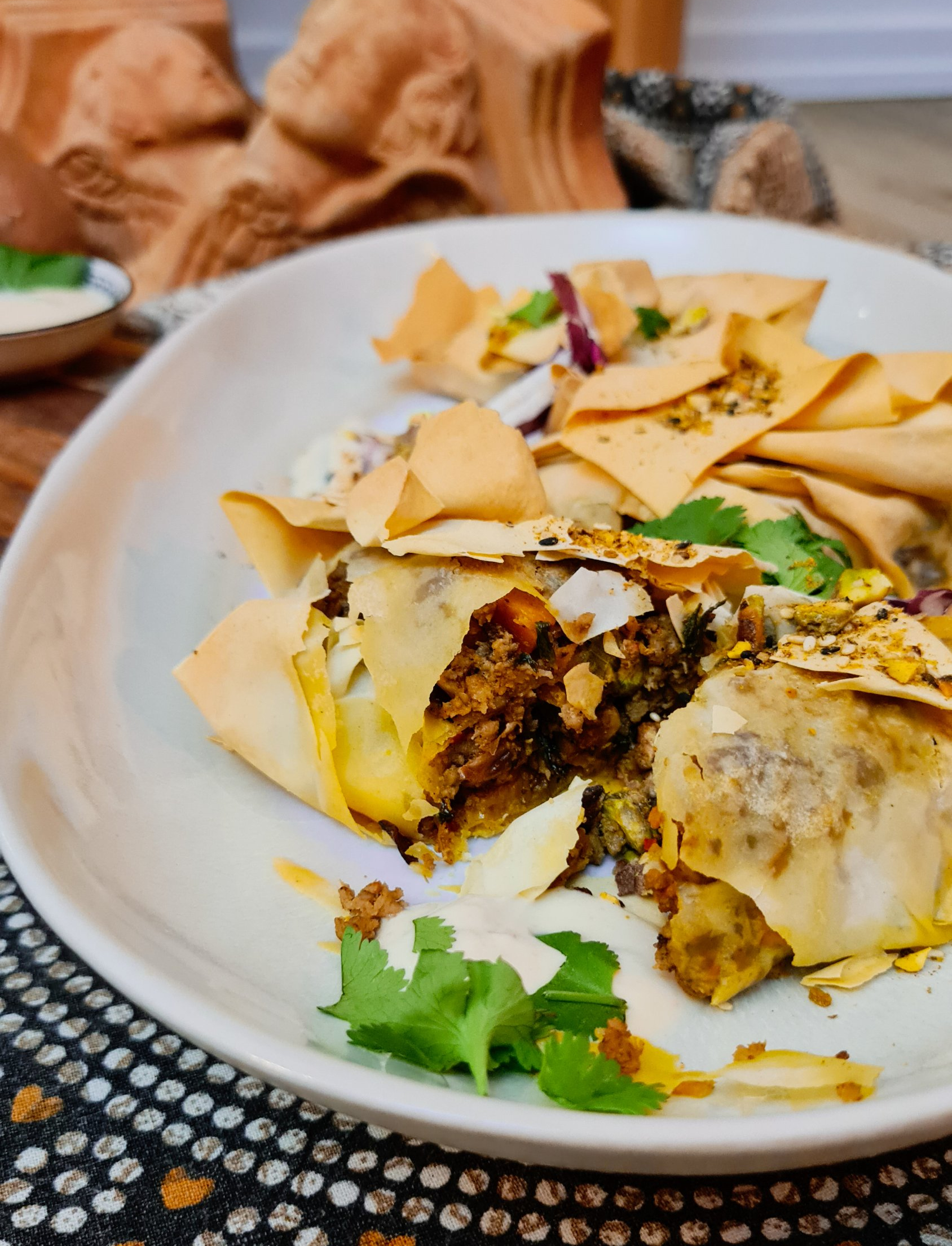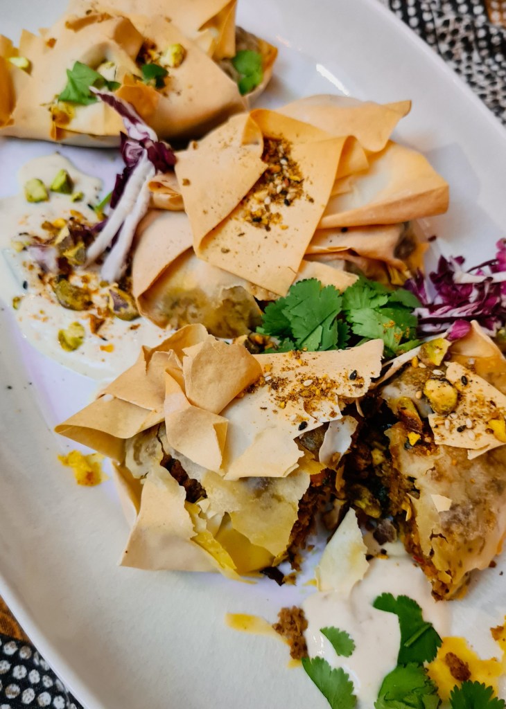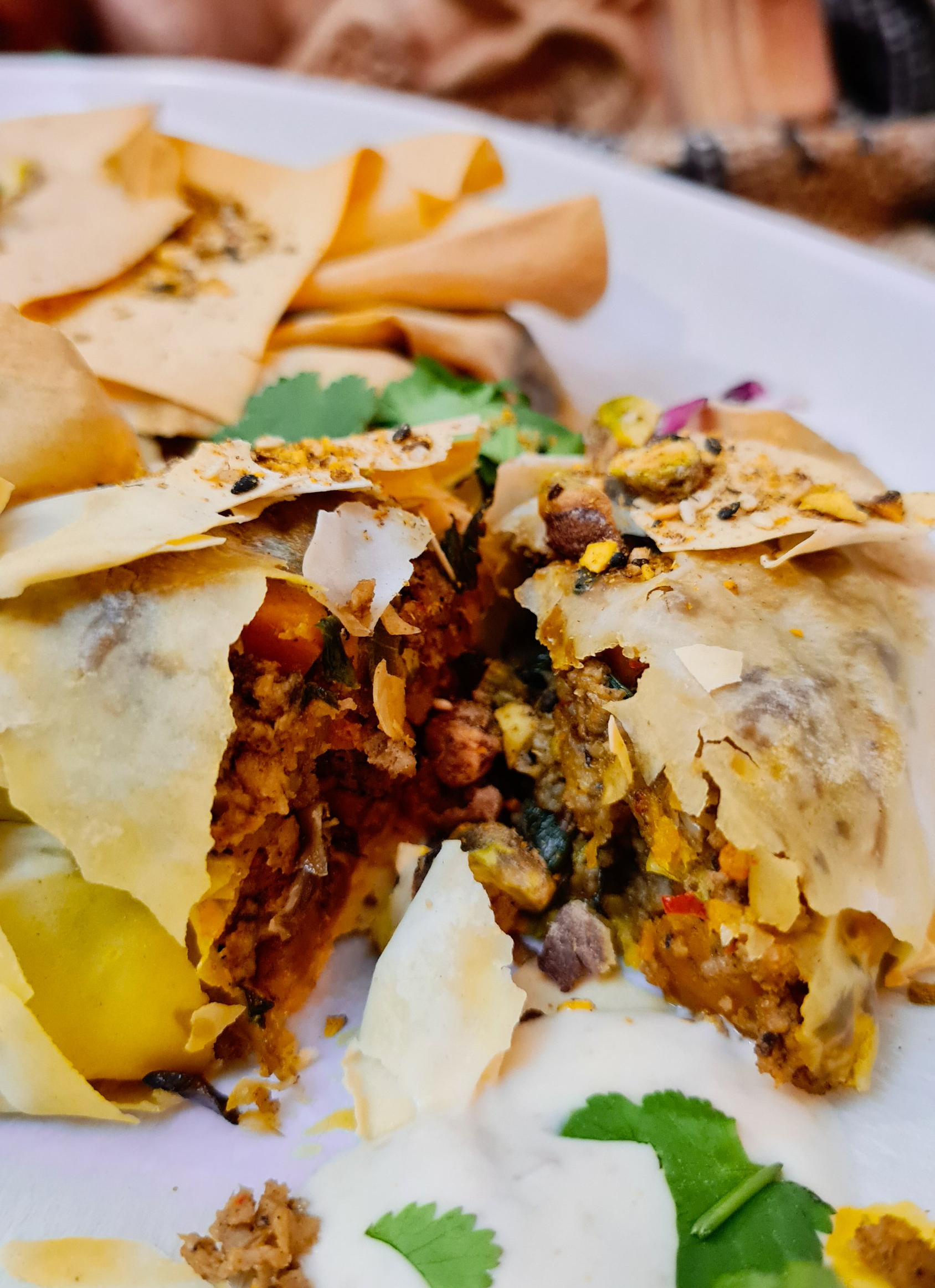 Die Filo-Teigblätter entsprechend der Beschreibung auf der Packung füllen und packen. Die fertigen Samosas im Backofen nach Packungsanleitung backen, bis der Teig hellbraun und knusprig ist.
