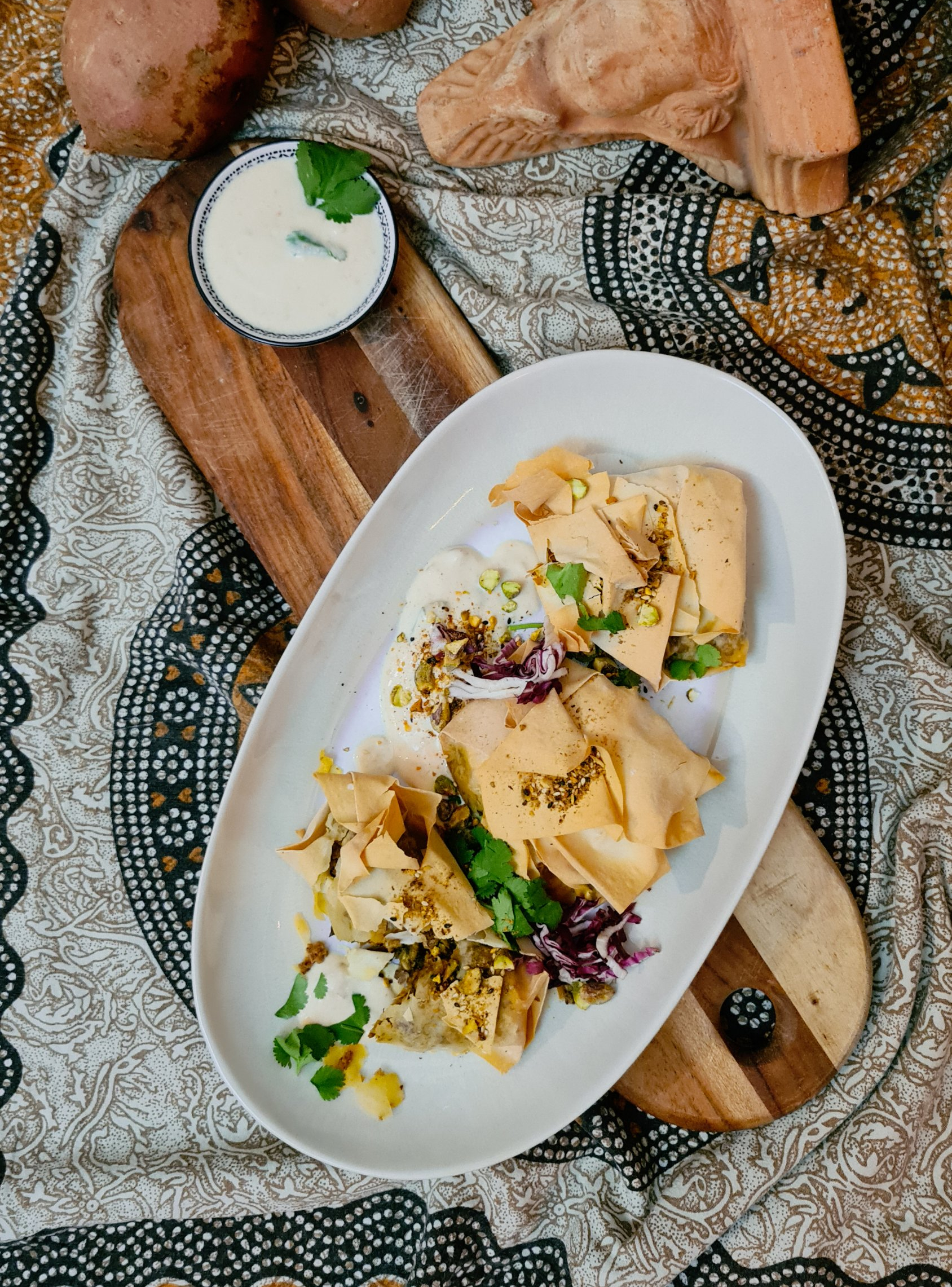 Die dampfenden Samosas mit einem Klecks Joghurtcreme anrichten und mit Dukkah bestreuen (stattdessen könnt ihr auch Sesam oder gehackte Pistazien oder Walnüsse verwenden).