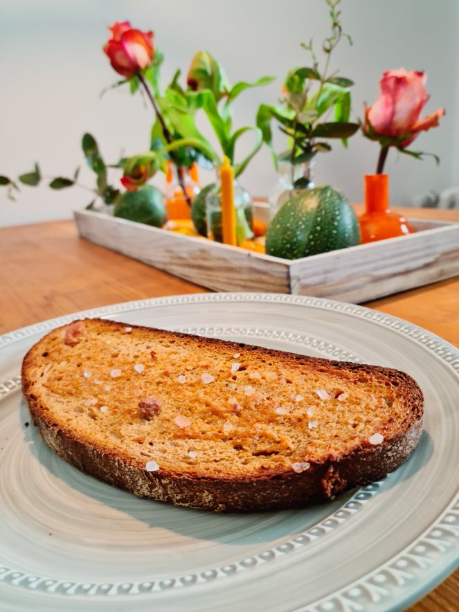 Für jeden Teller eine Scheibe des dicken Landbrots mit dem Knoblauchöl bepinseln, salzen und in den Ofen geben.