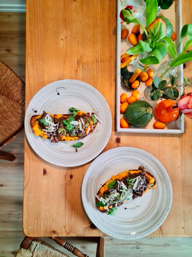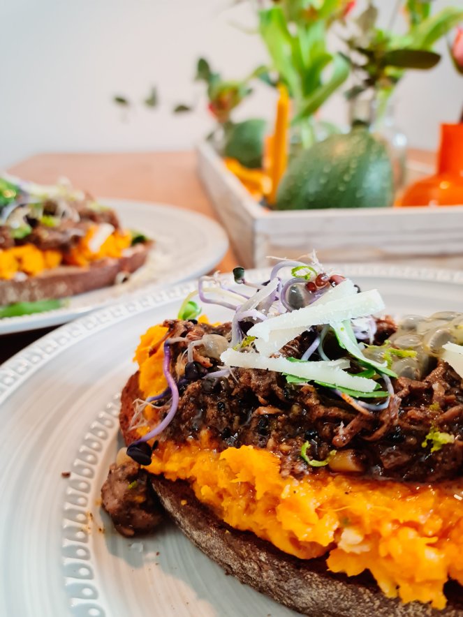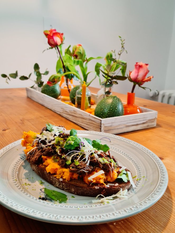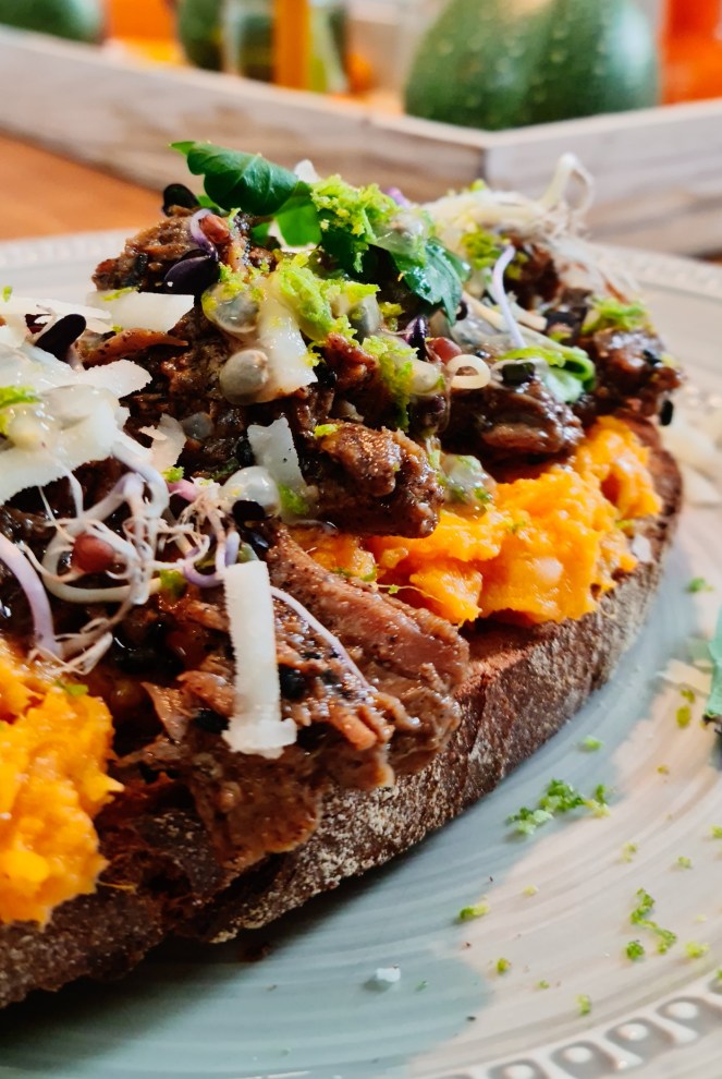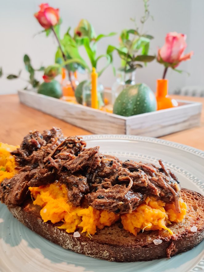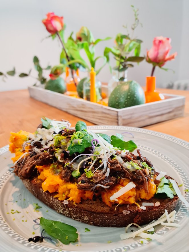Die Kombination von frischem Landbrot in dicken Scheiben, geröstet mit Knoblauchöl, darauf cremige Süßkartoffel-Parmesancreme und ein fantastisches Pulled beef aus Rindergulasch, schmeckt g i g a n t i s c h! Der Clou aber, so waren sich alle einig, war das Topping aus Passionsfrucht! Sie rundet diese besondere Brotzeit perfekt ab und kitzelt süß-säuerlich eure Gaumen!