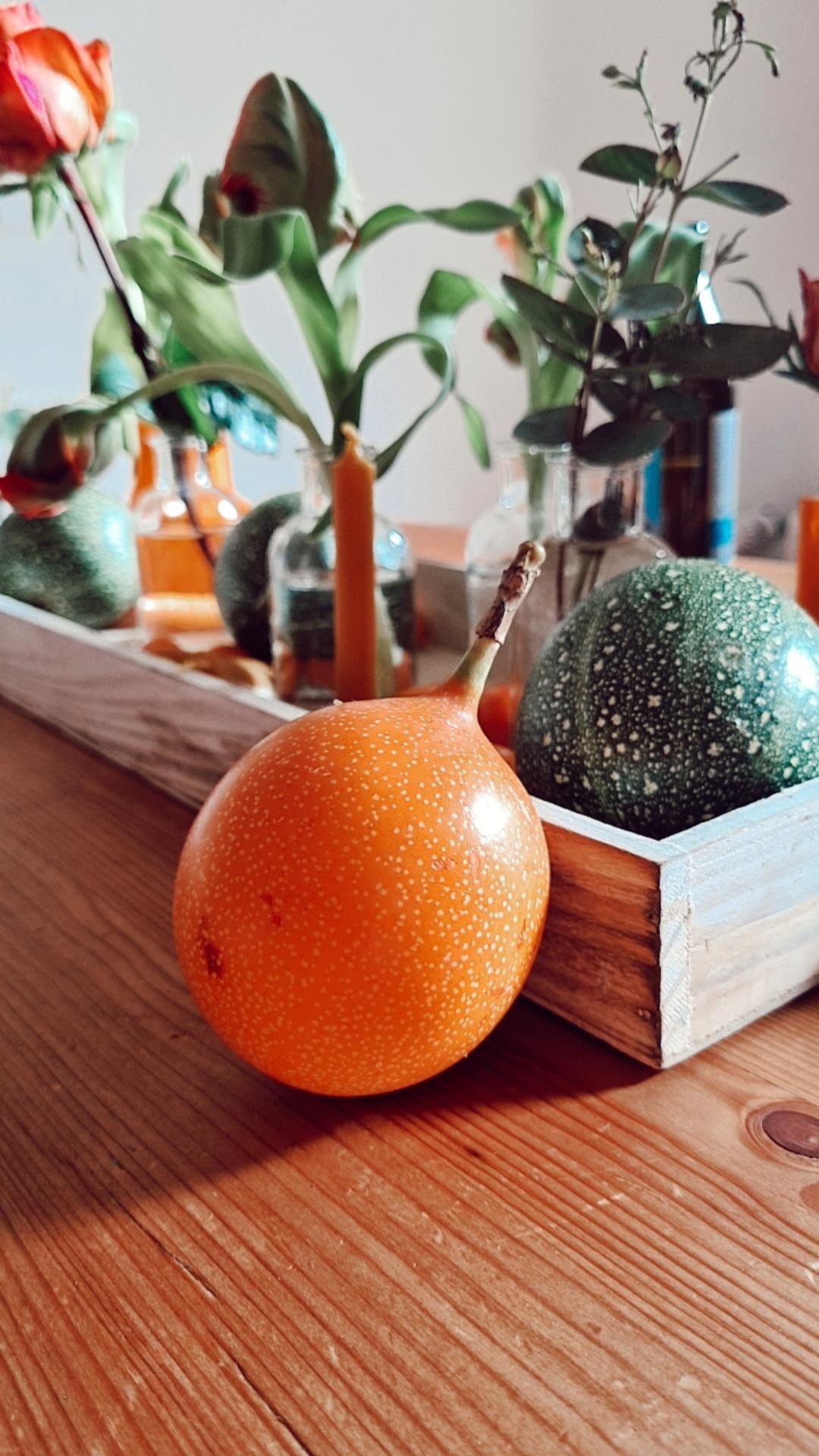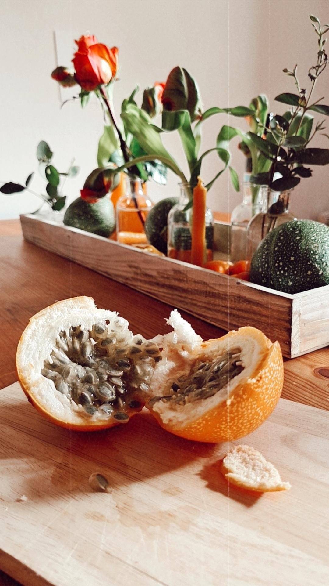 Dieses kleine Früchtchen stieß mir auf dem Wochenmarkt ins Auge. Obwohl die Verkäuferinnen vergessen hatten, wie sie heißt, packte ich eine ein. Sie ist einfach so schön orange! Da kann ich nicht widerstehen. UND ich dachte, dass es sich um eine neue, mir unbekannte, ungewöhnlich schmeckende Frucht handelt – ich war neugierig. Ein wenig war ich enttäuscht – es ist einfach eine M a r a c u j a ! Hättet Ihr`s gewusst? Ich dachte immer, Maracuja sei ein Synonym für Passionsfrucht. In Wahrheit ist die Passionsfrucht, die, die wir aus dem Supermarkt kennen – seine Schwester mit einer purpurfarbenen Schale. Und das hier eben eine Maracuja. Das Fruchtfleisch hinter den dicken Schalen sieht sich hingegen sehr ähnlich und schmeckt auch fast gleich, das eine ein bisschen säuerlicher. Die Enttäuschung wich, denn einmal aufgeschnitten, nutzte ich das Fruchtfleisch spontan als Topping (neben Sprossen, Parmesan und Kräutern). Eine großartige Fügung, die fruchtige Note rundete dieses Gericht perfekt ab!