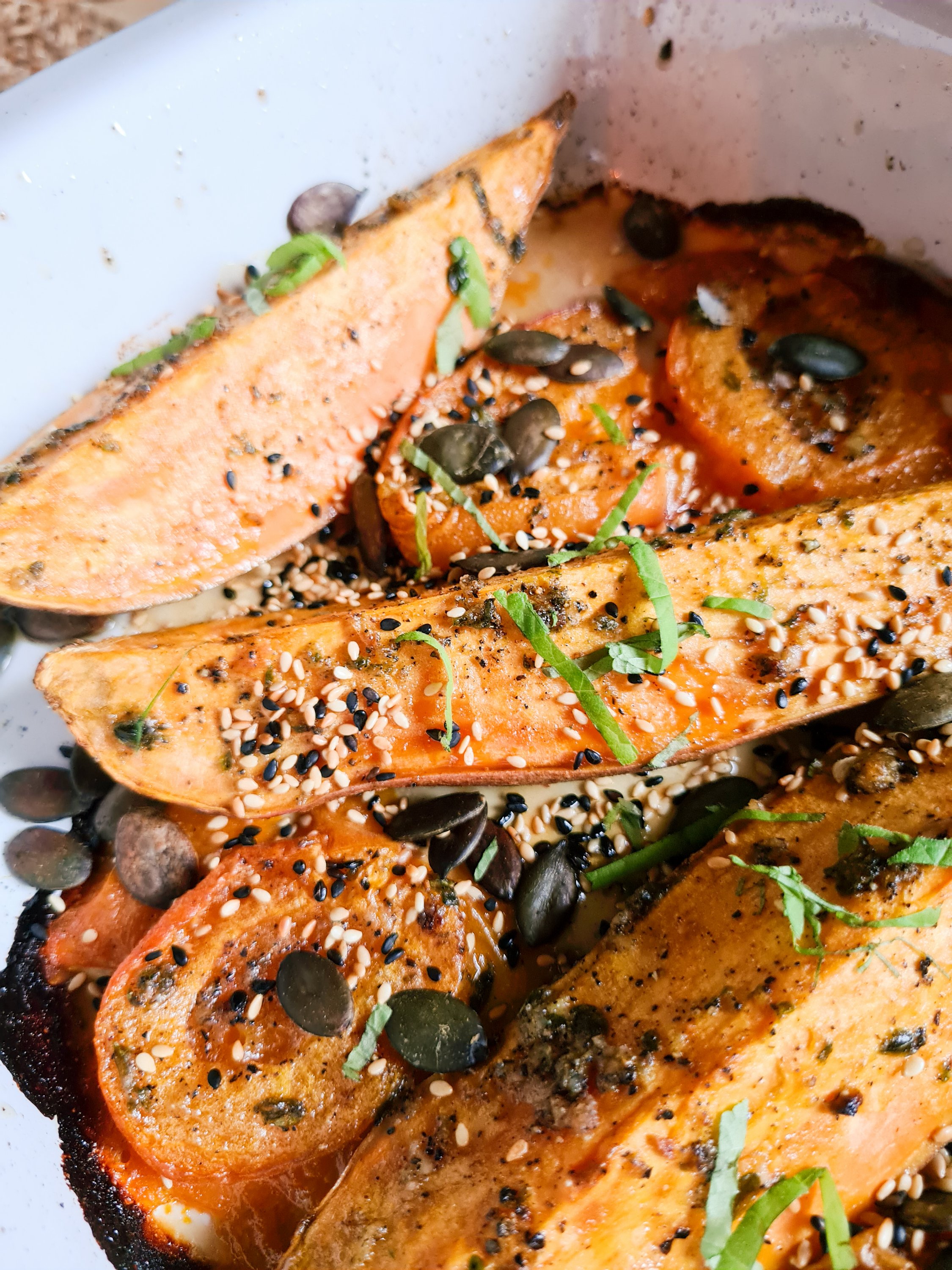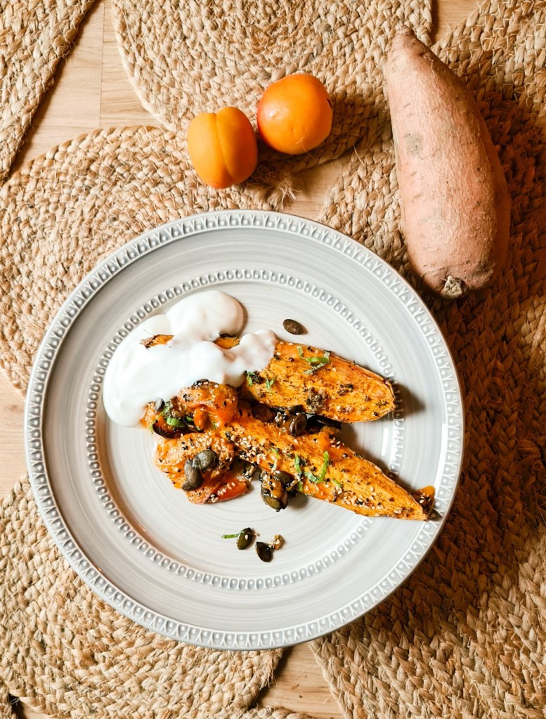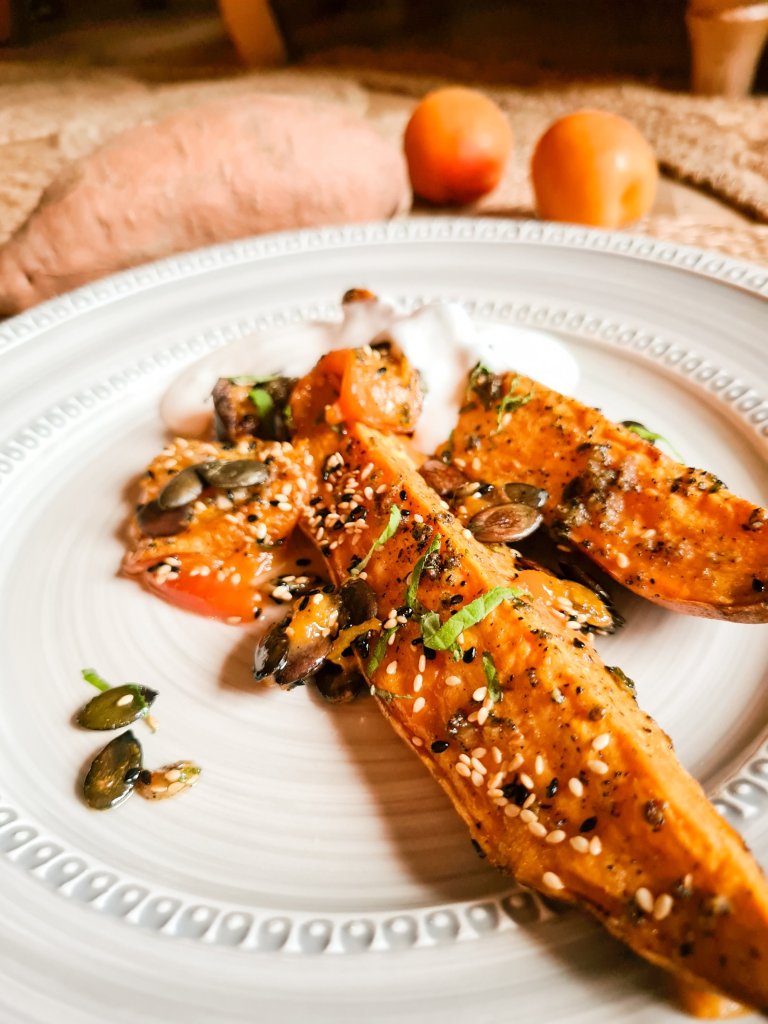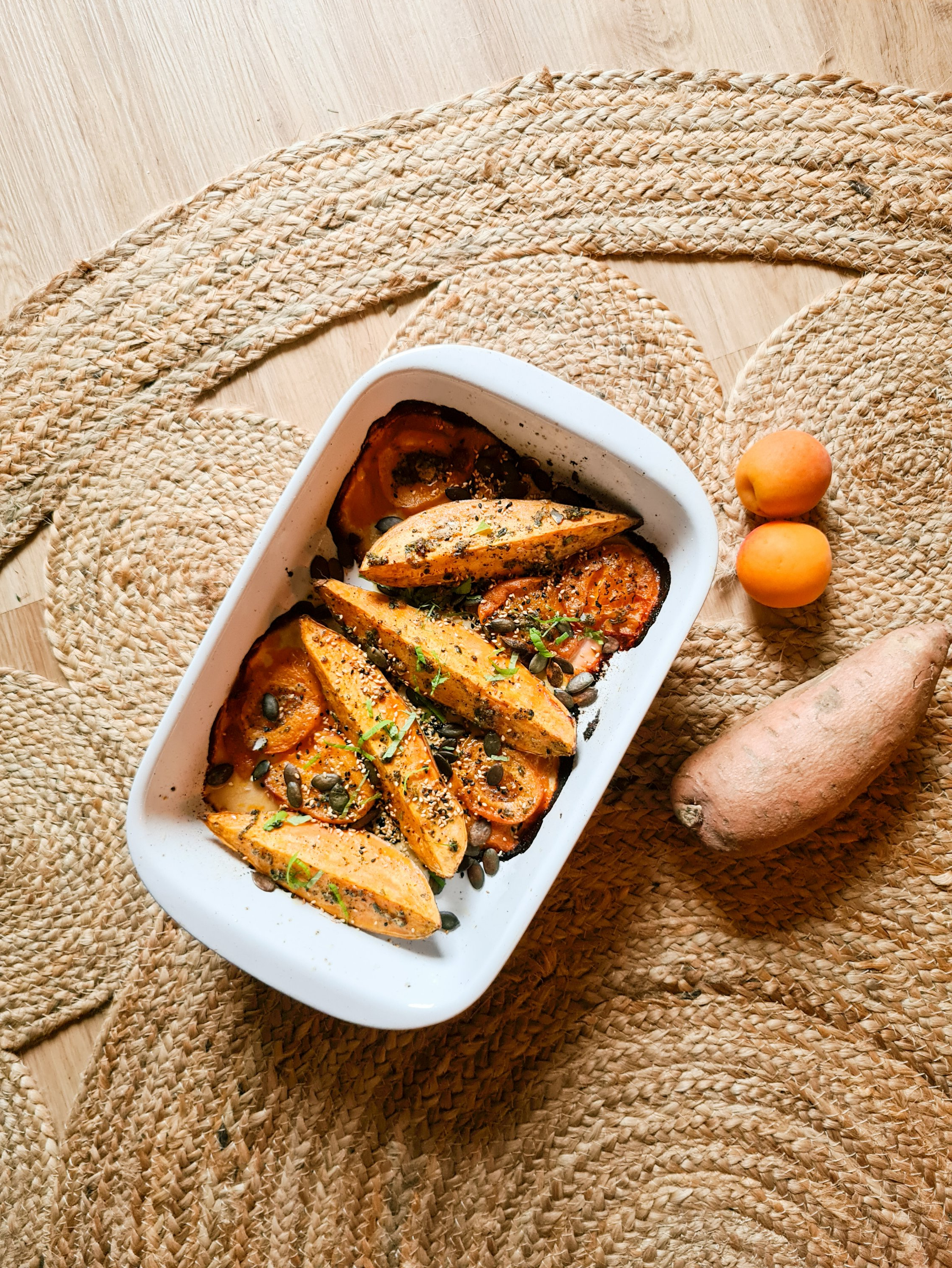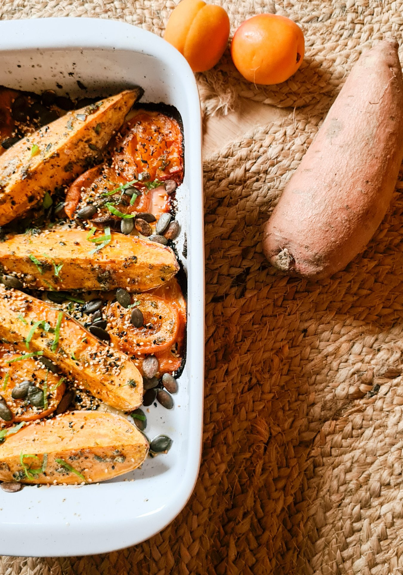 Süßkartoffeln und Aprikosen aus dem Ofen