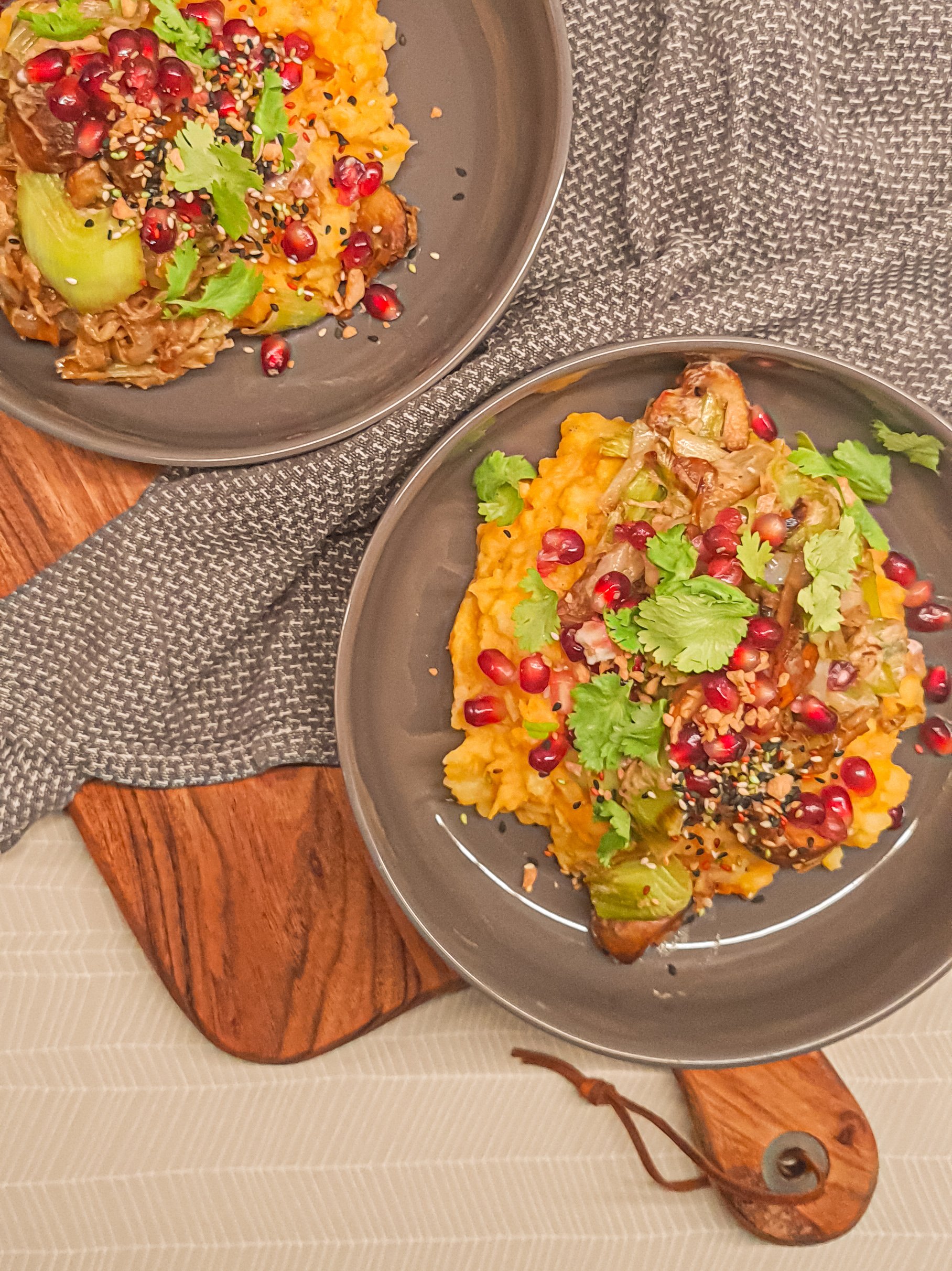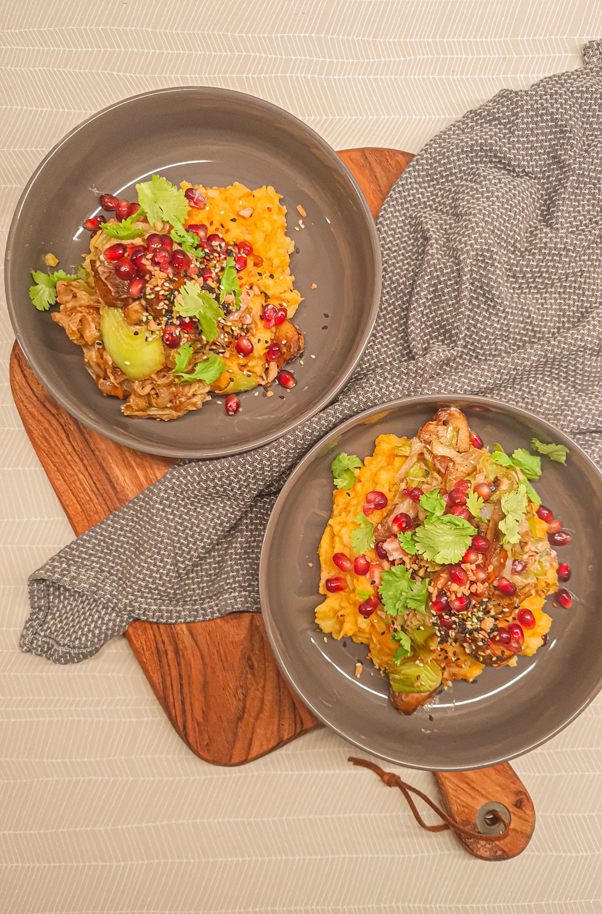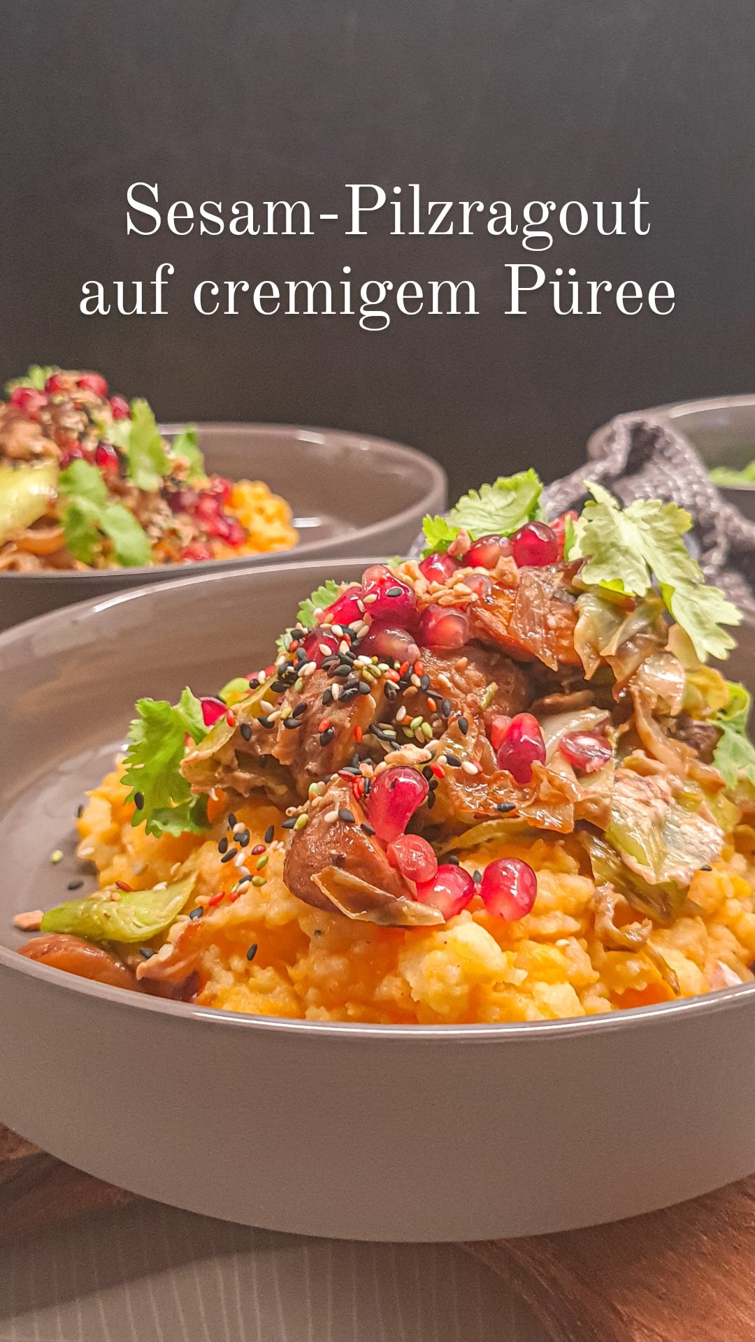 Zunächst das Püree (falls es in der Zwischenzeit angedickt ist, kannst du noch etwas (Pflanzen)Milch unterrühren) auf dem Teller anrichten. Das Pilzragout darüber geben und alles mit Granatapfel, Koriander und Sesam toppen.