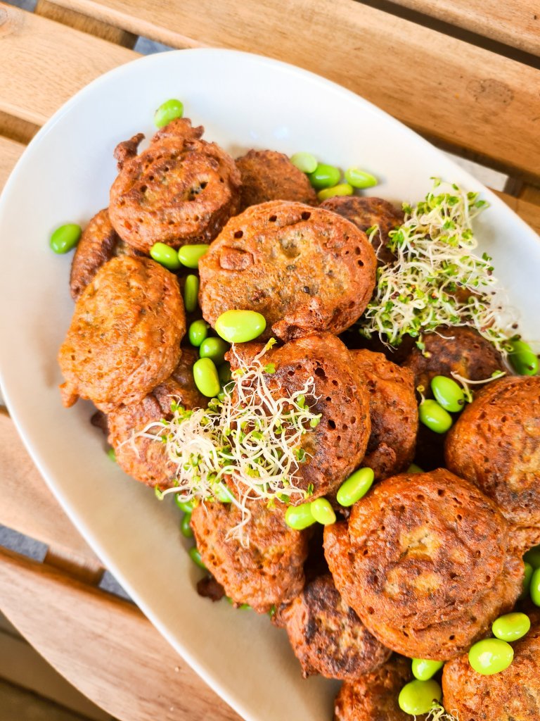Kurz vor dem Servieren ausreichend Fett in einer kleinen Pfanne erhitzen. Jeweils einen gehäuften Esslöffel des Falafel-Teigs ins Fett geben und ausbacken, bis sie außen goldbraun sind und sich Röstaromen entfalten. Das duftet!!