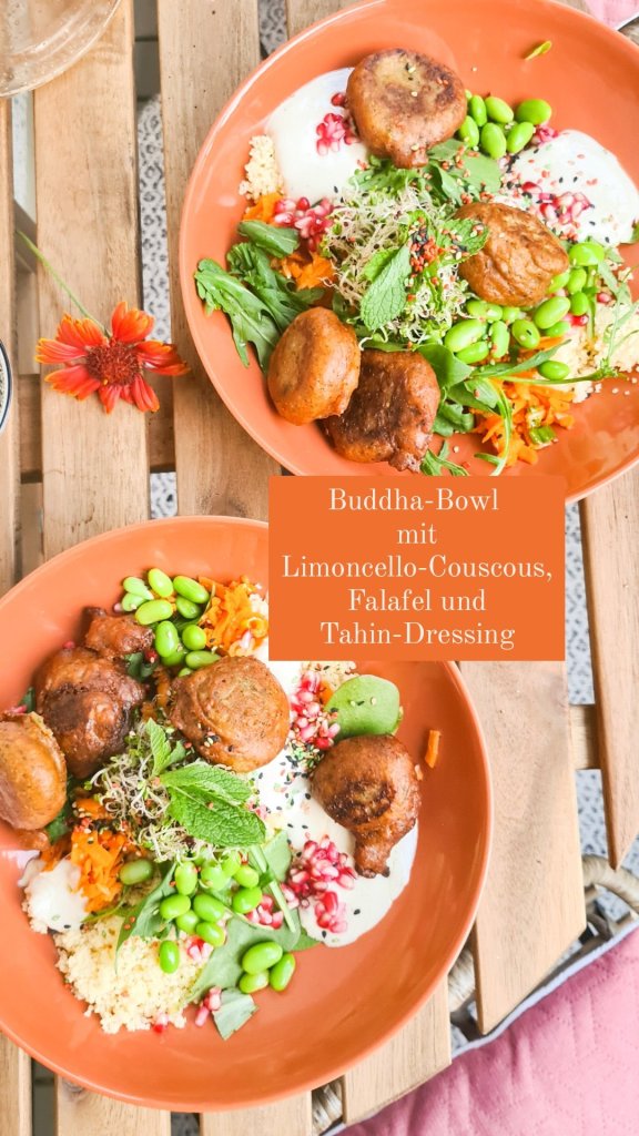 In der Zwischenzeit Limoncello-Couscous, Ruccola, Möhren, Edamame, Zuckerschoten und Sprossen auf Tellern anrichten. Hier und da einen Klecks Tahin-Dressing dazwischen setzen. On Top je 4 Falaffel-Bällchen geben und mit Granatapfelkernen, buntem Sesam und der restlichen Minze garnieren.