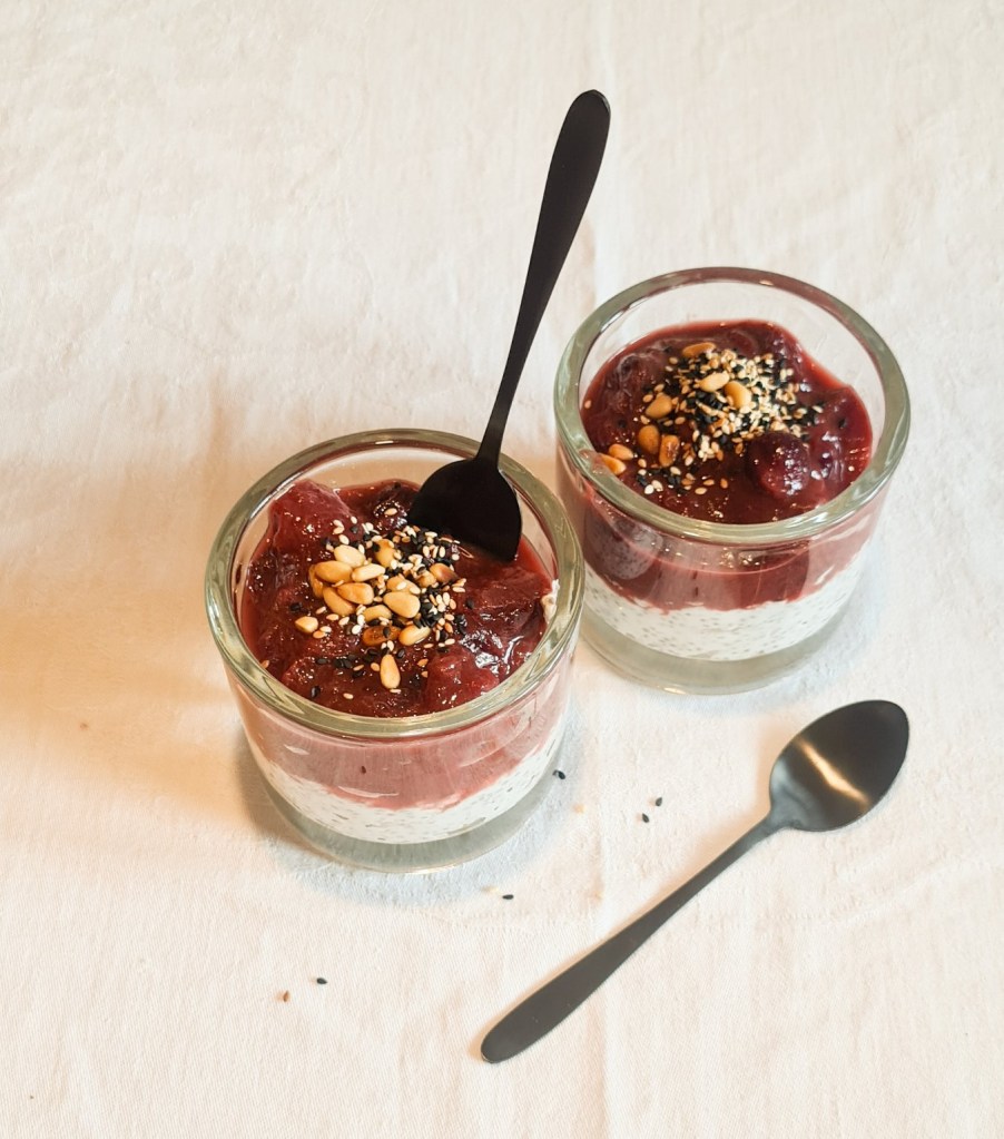 Die Chiasamen und den Zucker unter den Joghurt rühren. In Dessertgläser abfüllen. Den Kompott darüberlöffeln. Mit den Samen/Nüssen (ich nehme hier Pinienkerne und Sesam) toppen und bis zum Servieren im Kühlschrank ziehen lassen.