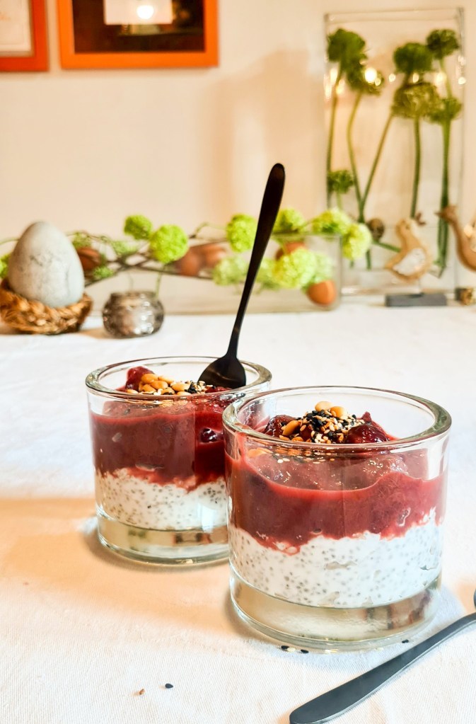 Tipp: Die Chia-Samen sollten im Joghurt grundsätzlich mindestens 15 Minuten quellen, besser noch länger, denn sie zeichnen sich aus durch ihr wahnsinniges Quellverhalten – ihr Volumen vergrößert sich um das zehnfache! Das fertige Chia-Gel (gequellt in Wasser, (Pflanzen-) Milch oder eben (Kokos-) Joghurt) hält sich im Kühlschrank 1-2 Wochen. Da das Superfood jede Menge Nährstoffe hat und sehr lange satt macht, eignet sich so ein Chia-Pudding perfekt als Frühstück – mit Obst oder Kompott perfekt!