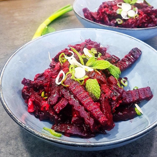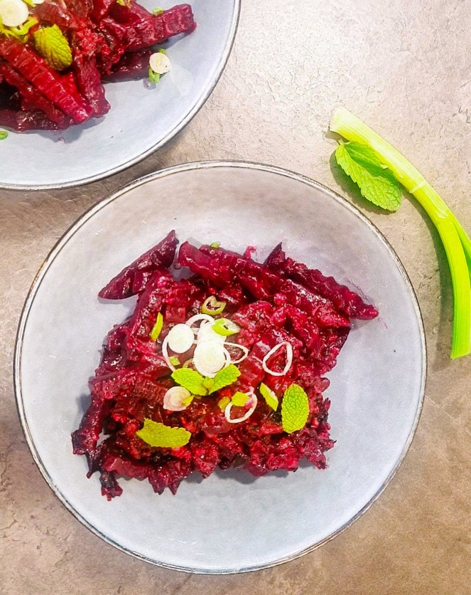 Entstanden ist das Rezept aus einem Missverständnis zwischen der Bete und mir: ich war davon ausgegangen, dass die Knolle weich wird, wenn sie längere Zeit mariniert. Geplant hatte ich einen Salat… wie sich herausstellte, ist dem nicht so. Die Bete war in der Marinade knallhart geblieben. Freche Knolle!