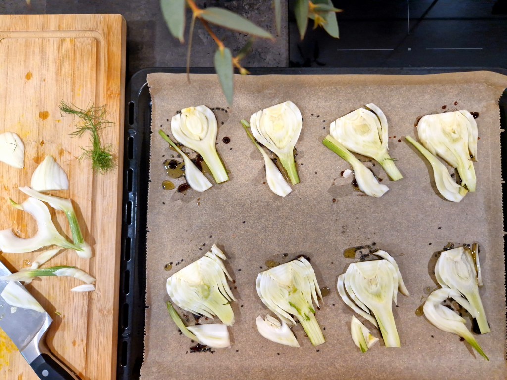 Fenchel/Lauch putzen und in geeignete Scheiben/Streifen schneiden und auf das Würzöl legen.