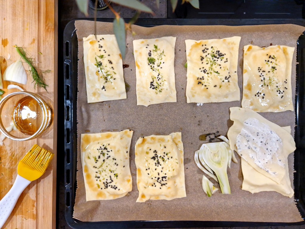 Die Oberseite des Blätterteigs mit etwas Öl bestreichen und die restlichen Samen darüberstreuen.