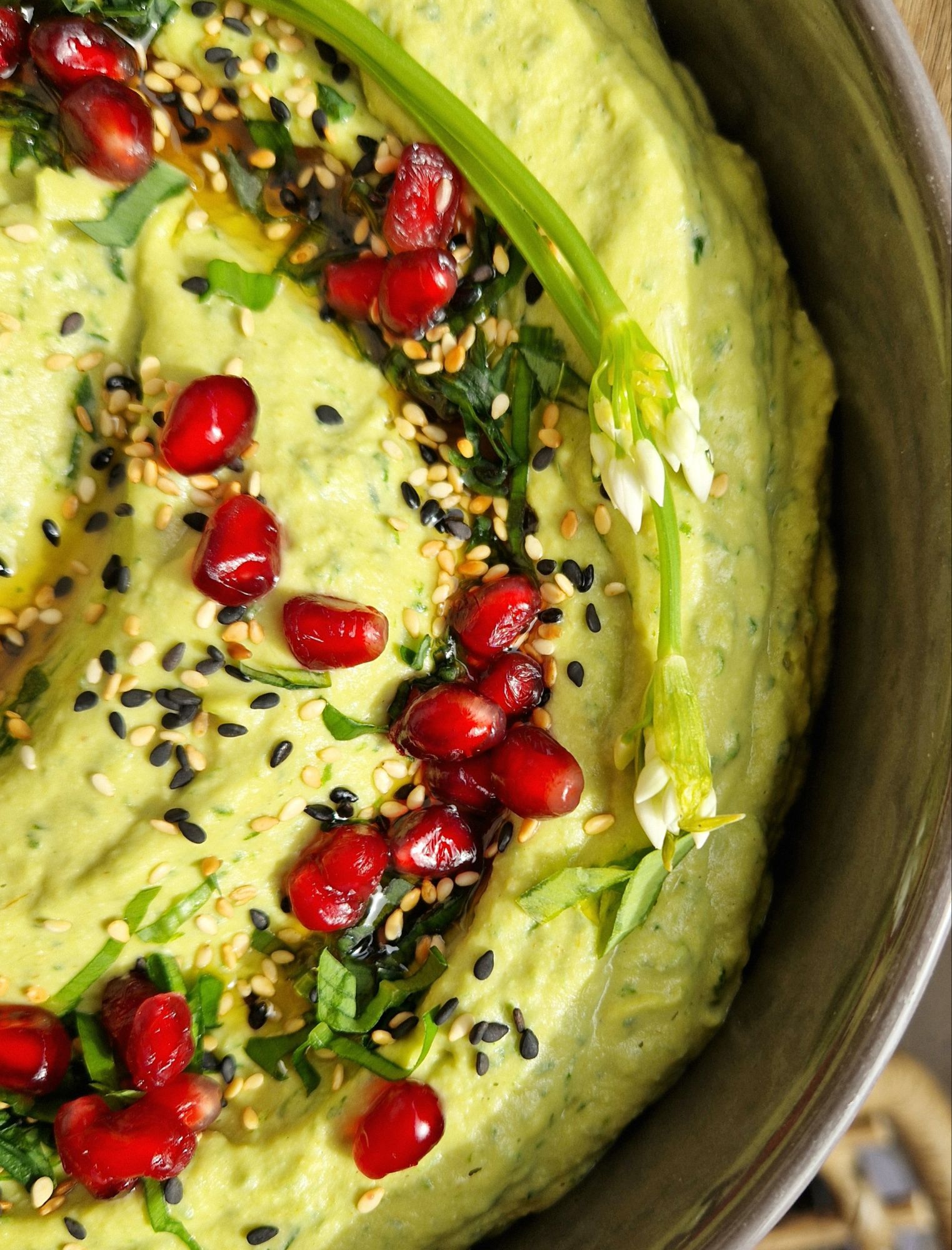 - Toppings (hier: Bärlauch in Streifen und wenn ihr habt die hübschen Blüten, Sesam, geröstetes Sesamöl, Granatapfelkerne)