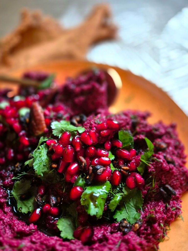 Hach, ich mag diese Paste einfach ständig und reichlich auf meinem Teller. Wenn du Bete magst, wirst du es lieben. Insbesondere bilden der säuerliche Sumak, der milde rote Pfeffer und der würzige Koriander die perfekte Symbiose mit der erdigen Bete.