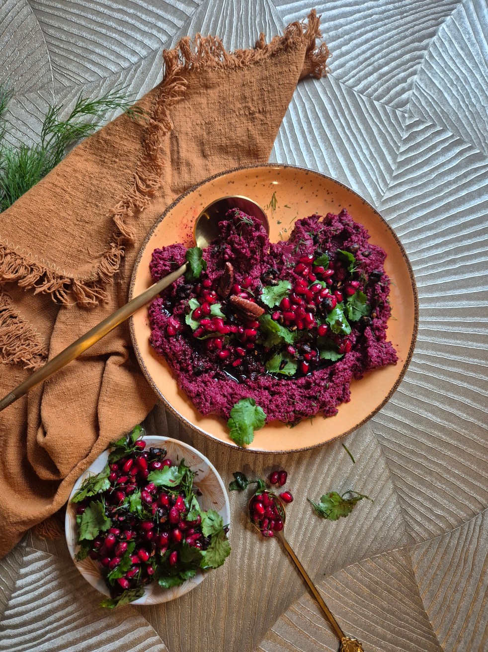 Bei orientalischen Mezze (Tapas / Vorspeisen) darf klassisches Muhammara aus Paprika und Walnüssen nicht fehlen. Hier darf ich euch die beste Freundin vorstellen: mit gerösteter Roter Bete und Pekannüssen.