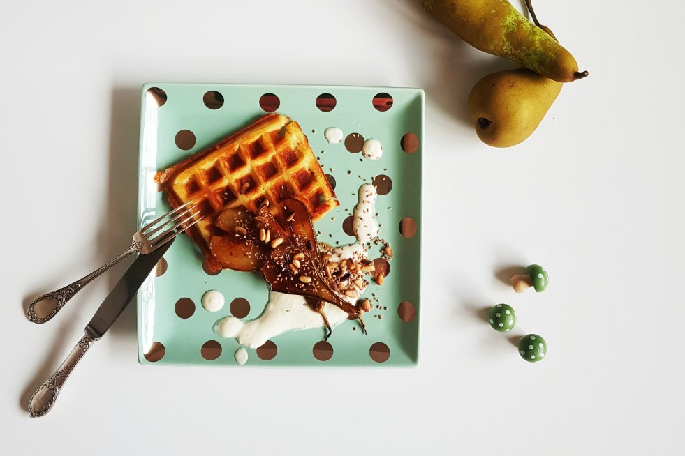 Rahmwaffeln und Whiskey-Birnen auf Orangencreme