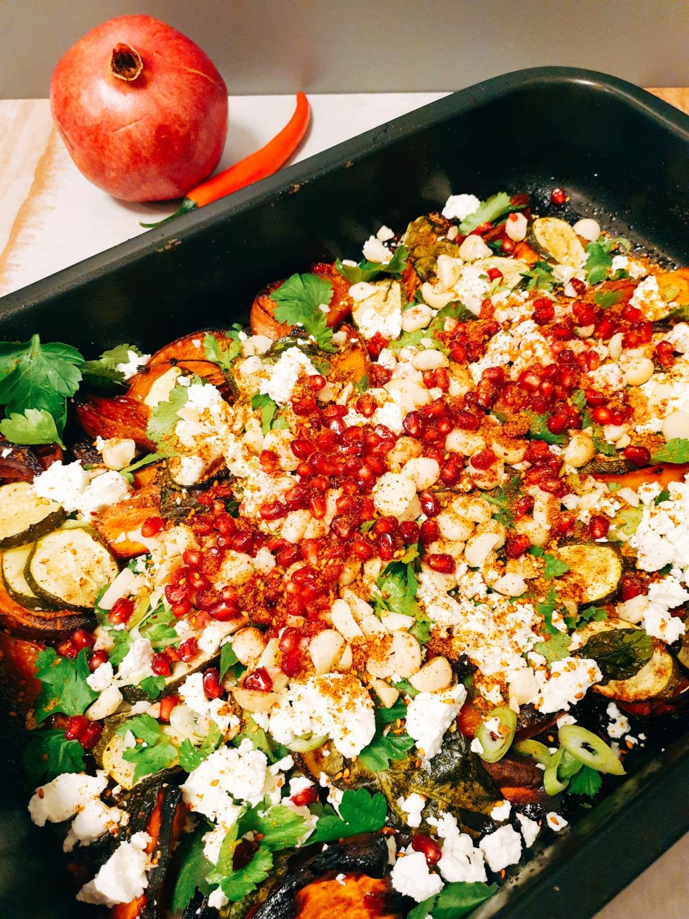 In saftiger Orangenreduktion karamellig gebackene Kräutersüßkartoffeln mit Zucchinis und Spinat getoppt mit frischen Kräutern, Schafskäse, Granatapfelkernen und Macadamia-Nüssen und verfeinert mit orientalischen Gewürzen. Leider geil!!
