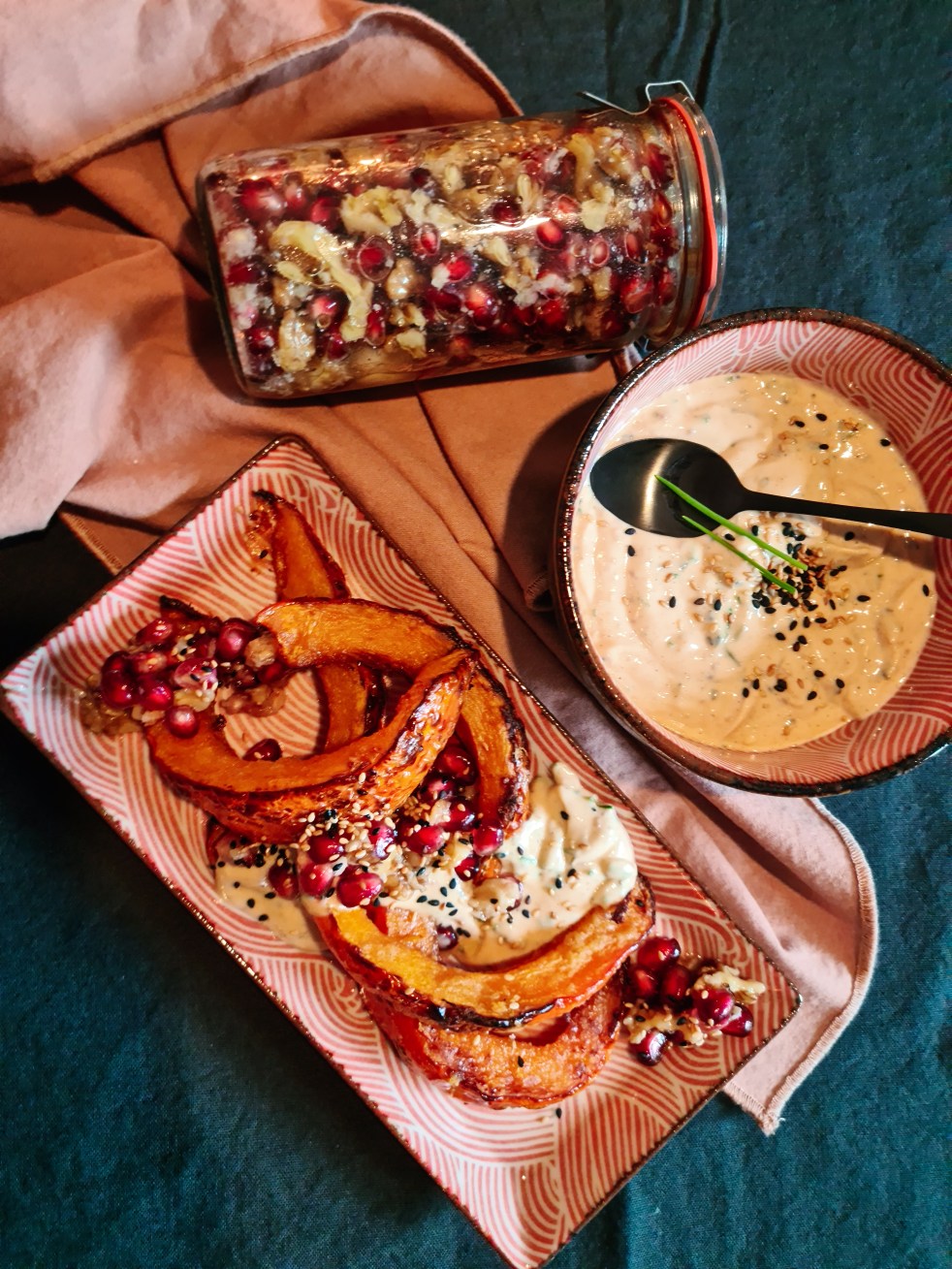 Einfach himmlisch, dieser geröstete Hokkaido, denn er wird begleitet von einem fruchtig-knackigen Dressing aus Granatapfel und Walnuss. On top gibt es eine vegane Creme aus Kokos-Joghurt mit Tahin. Ein echtes Feuerwerk auf euren Gaumen. Vegan kann!!