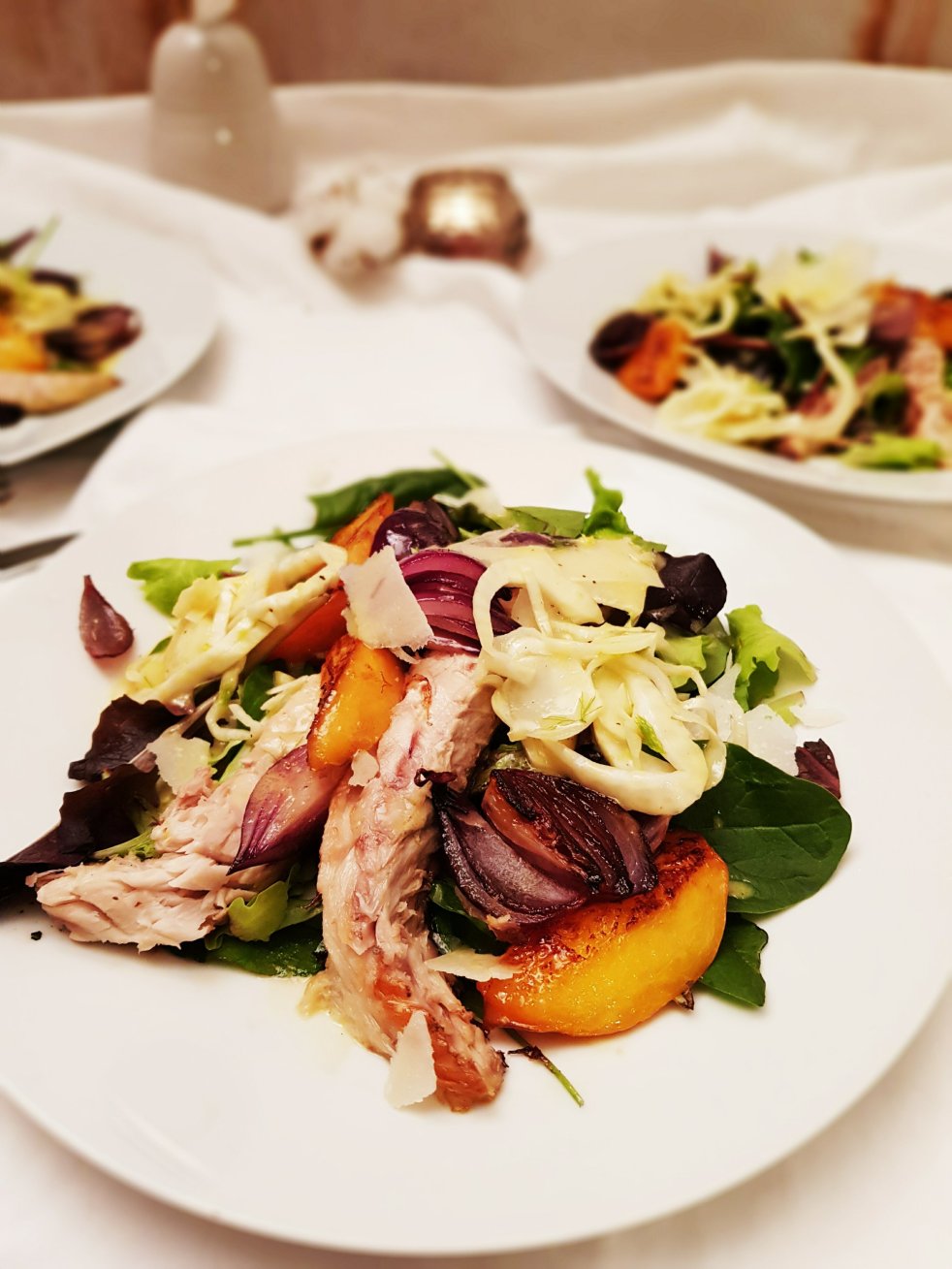 Salat mit gerösteten Pfirsichen, Räuchermakrele und Zitrusdressing